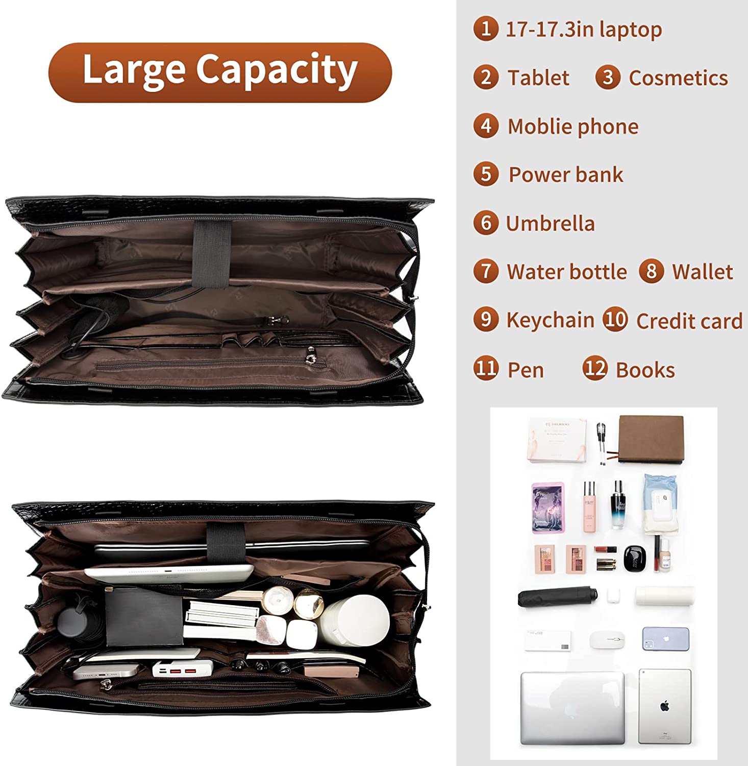 • 【Extra Large Capacity】: External: 1*large pocket; Inside: 15*pockets, every item is very orderly and convenient to access, just need a leather laptop bag to hold your 17-17.3 Inch laptop ,daily necessities, book, file, cosmetics, office supplies and so on.