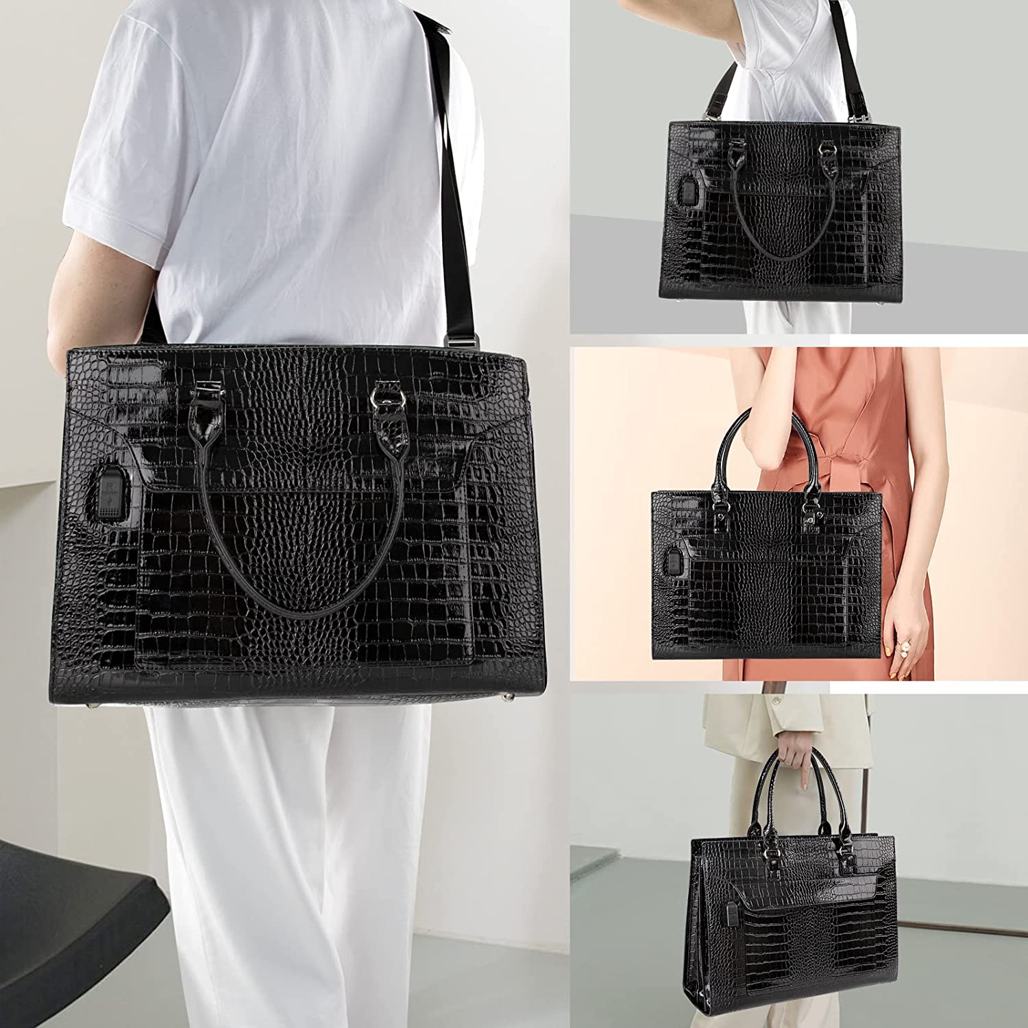 • 【High Quality Material】: Fashion waterproof black leather, the polished silvertone hardware,easy to clean, wear-resistant and anti-wrinkle make this womens laptop bag last longer. Top zipper closure. In addition, metal feet base protects this laptop briefcase from damage.