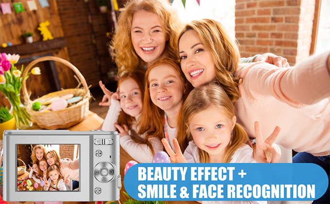• 【Multifunctional & Best Gift】This digital camera point and shot support continuous shooting, Beauty face, anti-shake, face detection, smile capture, and Selfie timer functions. This camera is the best gift for grandparents, fathers, mothers, teenagers, children, and students, whether it is Mother's Day, Father's Day, Thanksgiving Day, birthday, and Christmas.