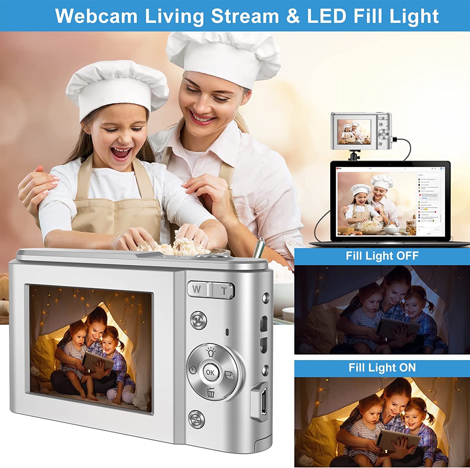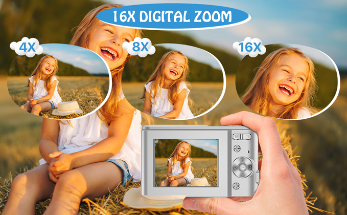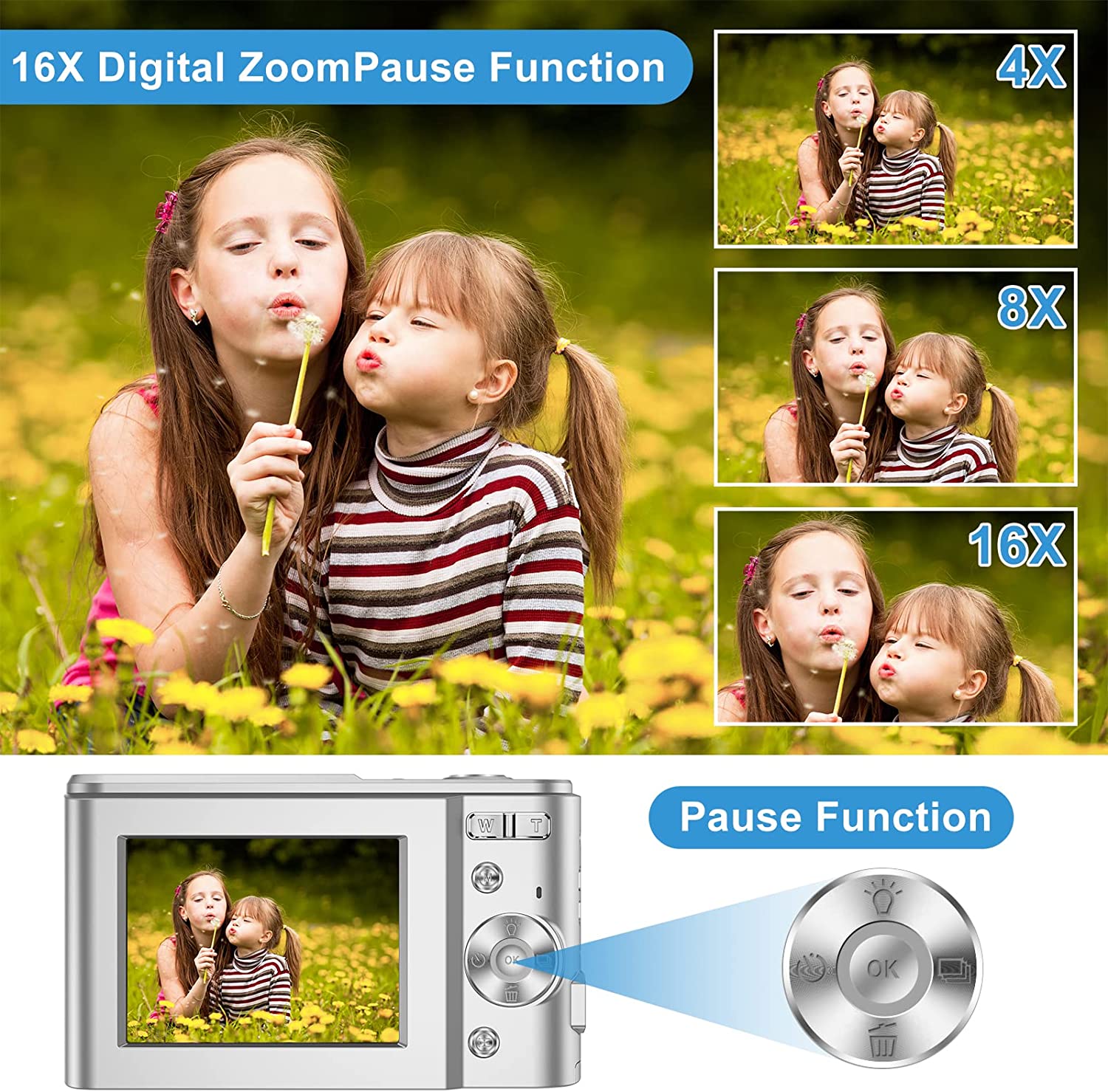 • 【16X Digital Zoom & Pause Function】This kids camera for teens supports 16x digital zoom, which can magnify photos and videos. The kid camera for girls boys and adults also has a pause function, you can press the "OK button" to pause when recording or playing a video. The built-in fill light can help you take high-quality photos in the dark. The external tripod interface can be installed with a tripod to help you stabilize shooting.