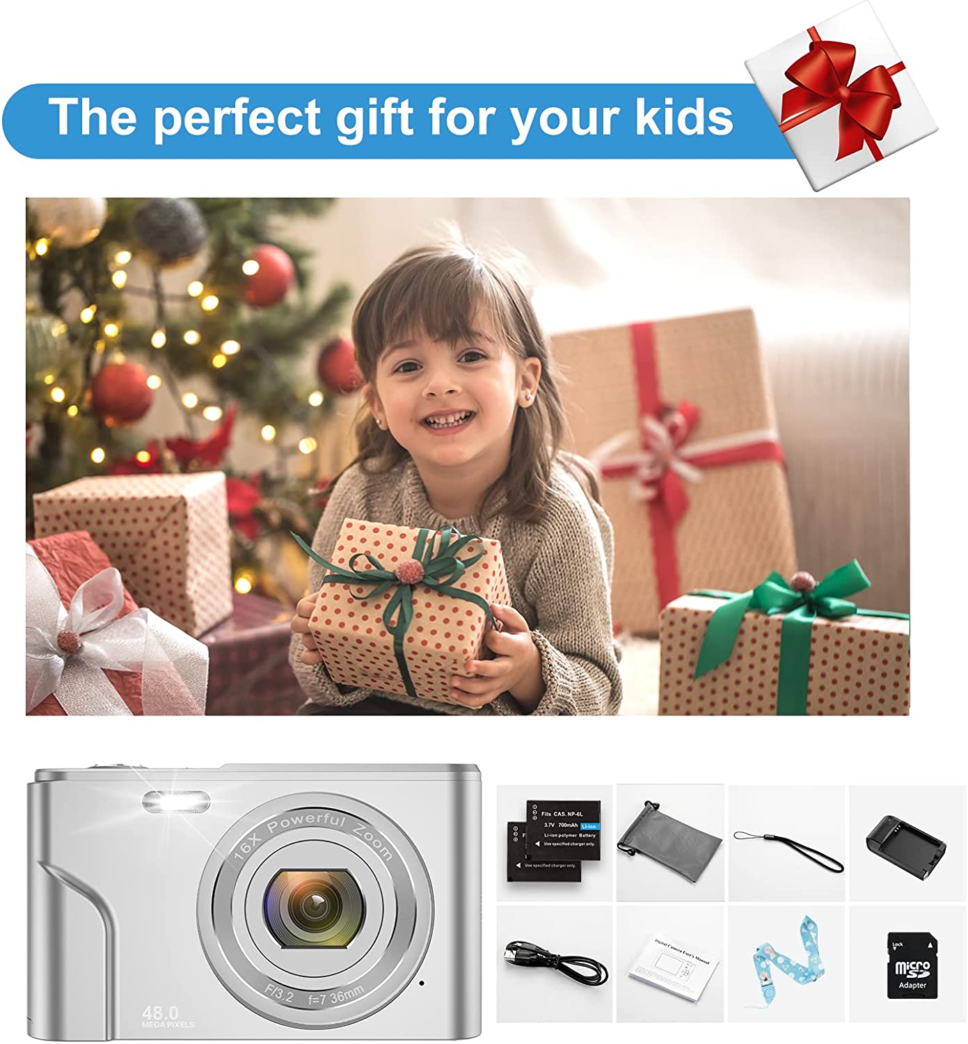 Digital Baby Camera for Kids Boys Girls Adults,1080P 48MP Kids Camera with 32GB SD Card,2.4 Inch Kids Digital Camera with 16X Digital Zoom, Compact Mini Camera Kid Camera for Kids/Teens(Silver)