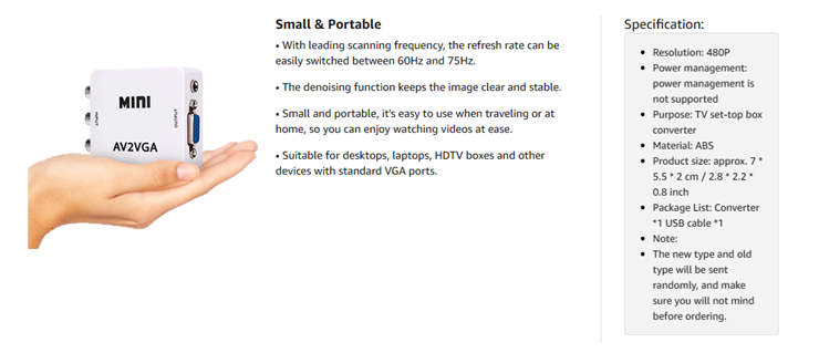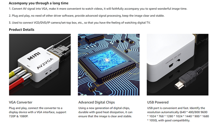 • 【VGA Converter】Connect the converter to a display device with VGA interface for monitoring the old AV red, yellow and white interface of set-top box DVD recorder and convert AV video signal to VGA.