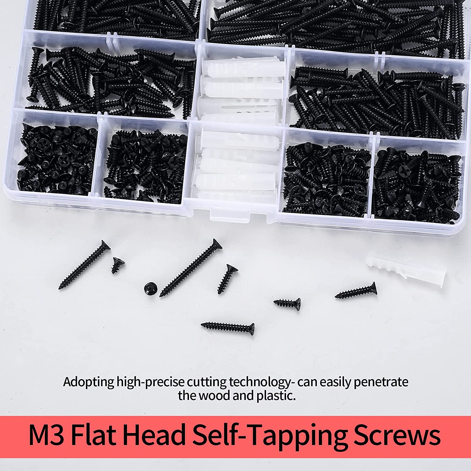 430 Pcs M3 Black Wood Screws Assortment Fasteners Kit, Cross Drive Head Countersunk Head Self-Tapping Screws, Assorted Flat Head Round Head Screws with 20 Pcs Plastic Wall Screw Anchors
