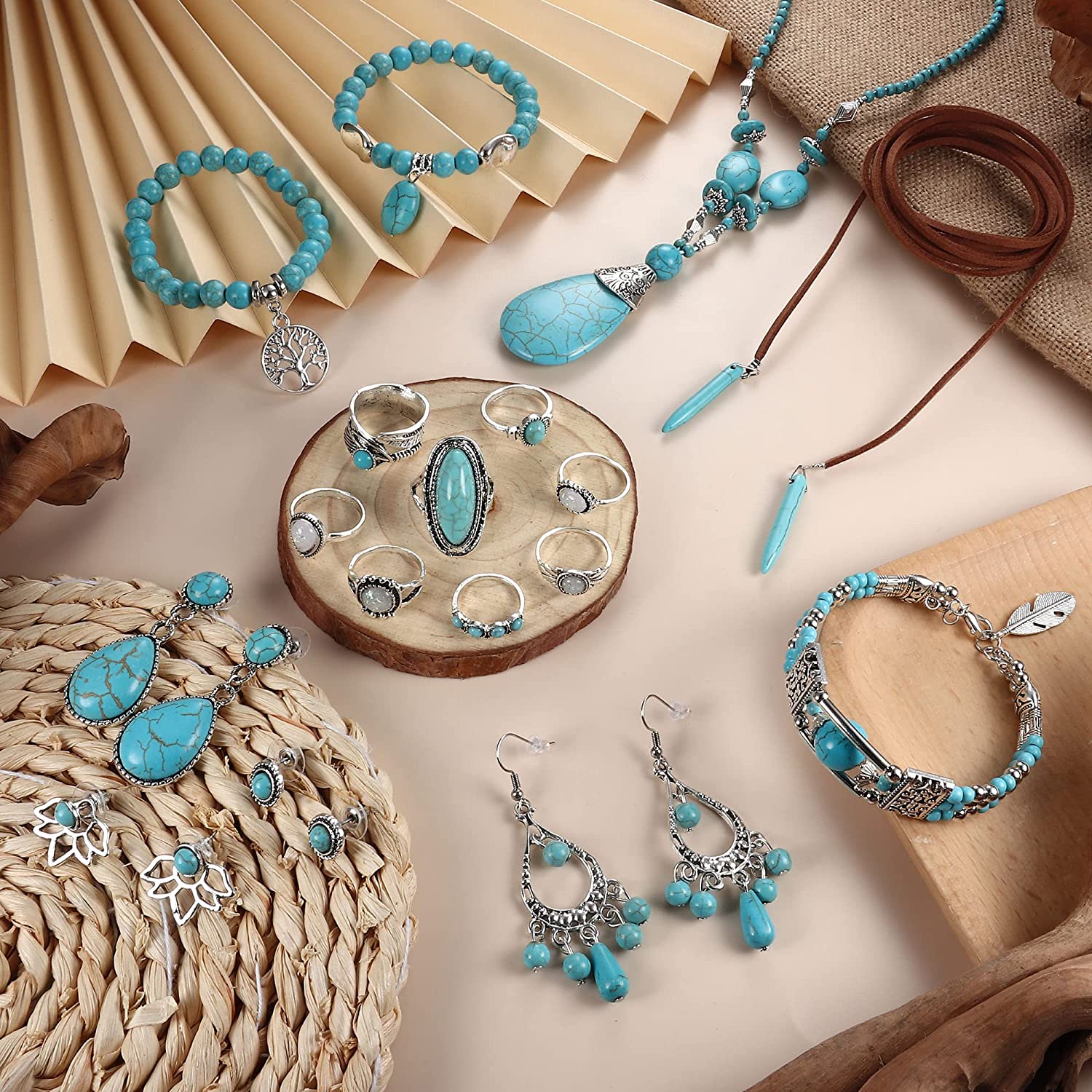 【TURQUOISE JEWELRY SET】Turquoise jewelry set includes 1 piece turquoise pendant necklace and 1 piece boho choker necklace, 1 piece layered turquoise bracelet and 2 piece adjustable turquoise bead bracelet,4 pairs of turquoise earrings and 8 pieces turquoise knuckle rings. Retro and fashion are perfectly combined to create a charming appearance for you.