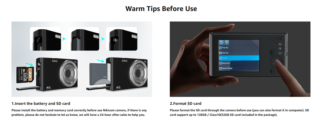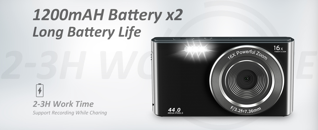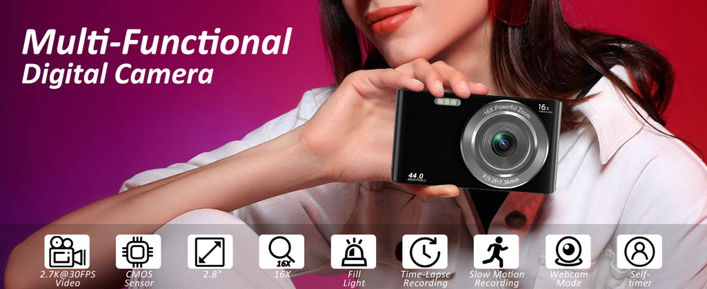 - 【4K & 44MP Digital Camera for Photography】NIKICAM 4k compact photography camera for kids girls boys adults has 4k video resolution and 44MP image resolution, and support 16X digital zoom, helping you capture and record the most exciting memorable moments with high-quality images or videos. This rechargeable digital camera come with a 32GB SD card, just turn the camera on and record the exciting moments wiht your family now!