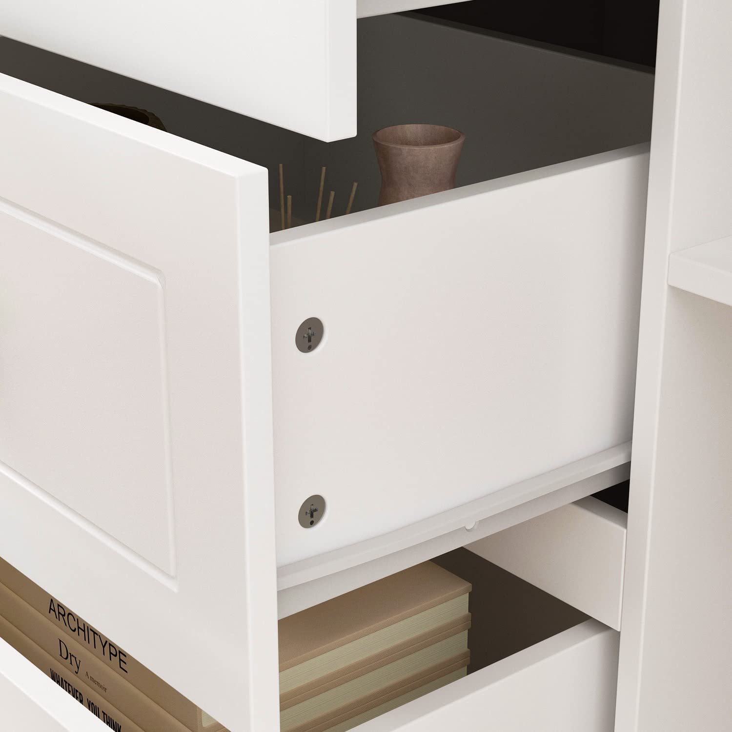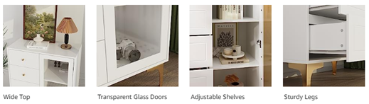 【Sturdy & Durable】This white storage cabinet is crafted from engineered MDF board, particle board, iron and glass. The thick boards with melamine coated surface is sleek and easy cleaning, the drawers equip sliders to ensure smoothly opening and closing.