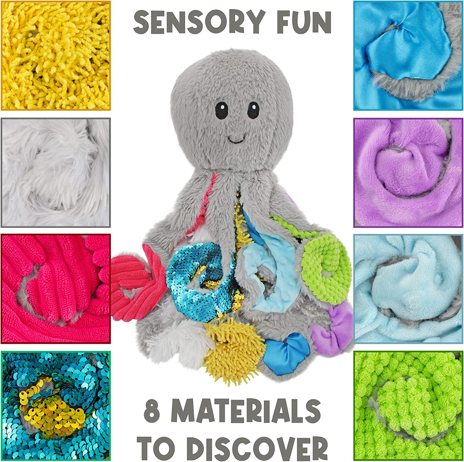 UNIQUE SENSORY EXPERIENCE: Quiggly the Octopus stuffed animal weighs 1 lb. and provides your child with a unique sensory experience. Each of the Octopus tentacles have a different sensory material for your child to discover.