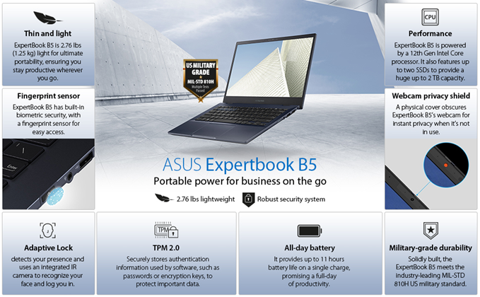ASUS ExpertBook B5 Thin & Light Business Laptop, 14” FHD, Intel Core i7-1260P, 1TB SSD, 16GB DDR5 RAM, All Day Battery, Enterprise-Grade Video Conference, NumberPad, Win 11 Pro, B5402CBA-XVE75