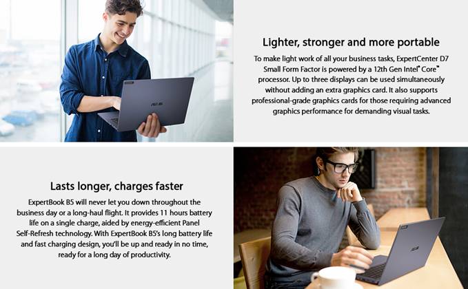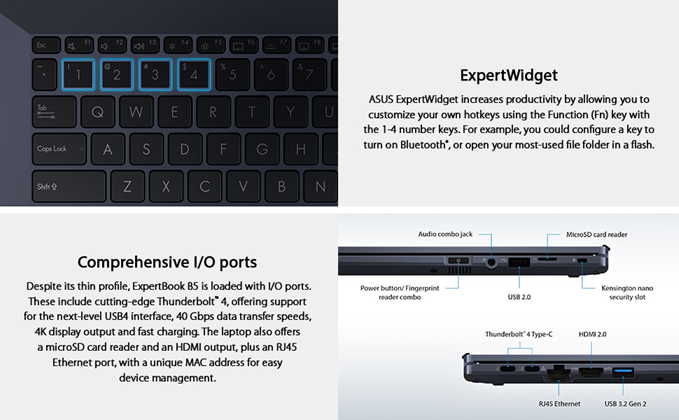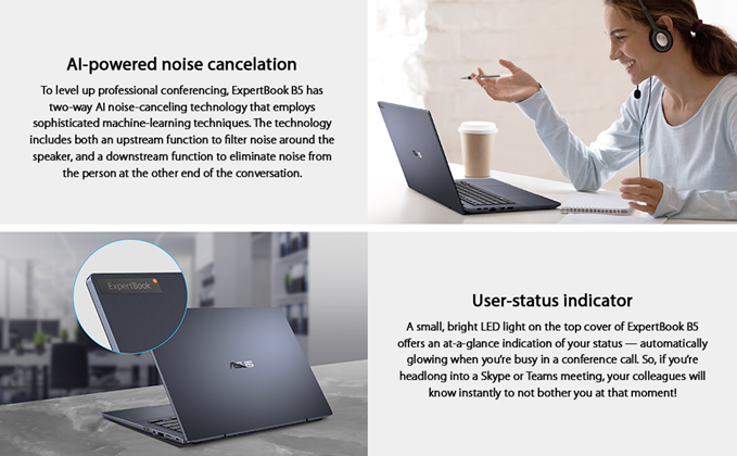 ASUS ExpertBook B5402 is built for business success in style, with a precision-crafted chassis that’s as light as 2.75 lbs. It’s also set for serious travel with an amazing all-day battery life, and is engineered with many cutting-edge technologies to improve your on-the-go work efficiency. These include an Intel Core processor, AI noise cancellation, ASUS NumberPad. It’s also packed with features to protect your privacy and business data, including a built-in fingerprint sensor and TPM 2.0 chip.