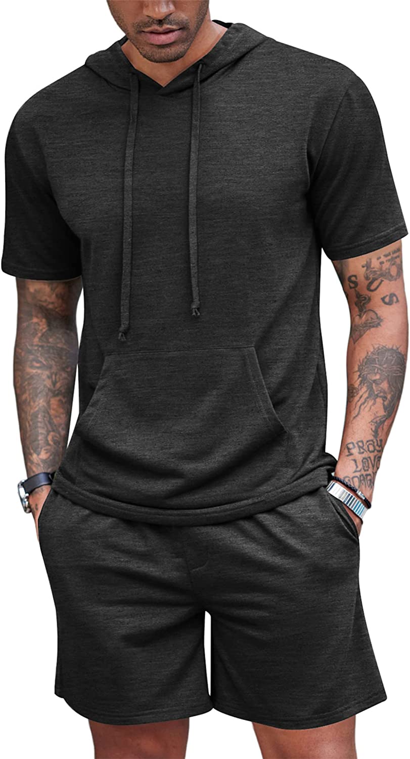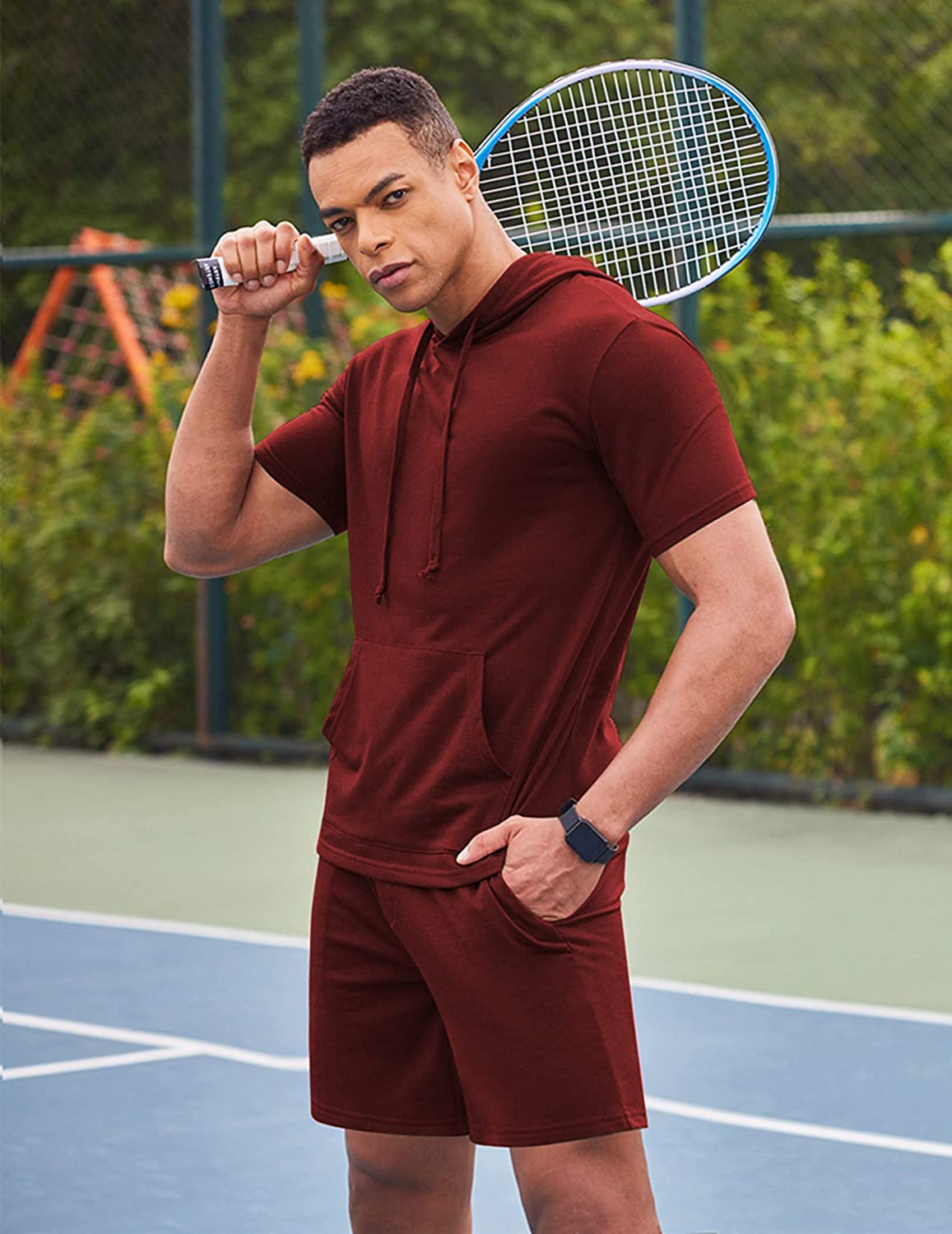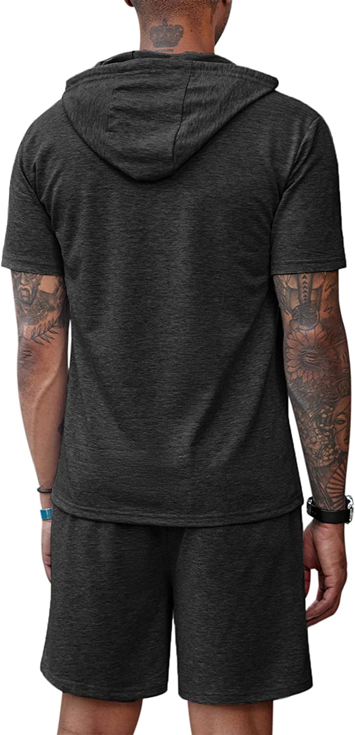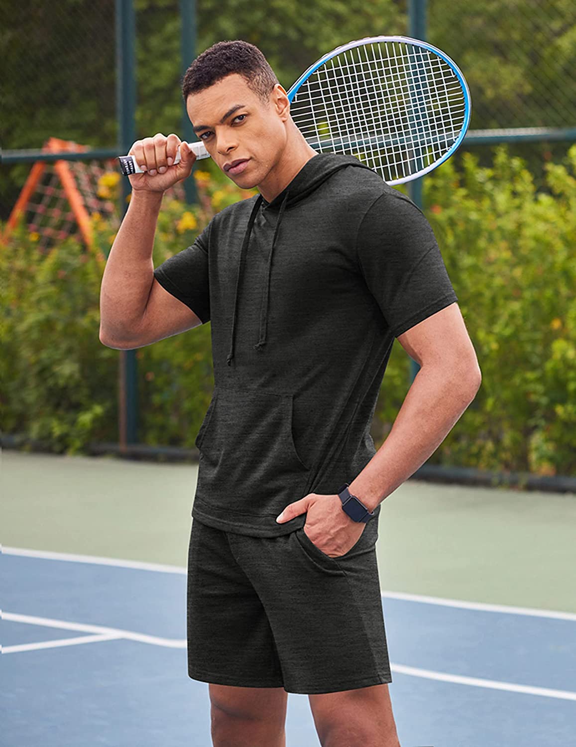 • Two Piece Tracksuit Design: Mens gym hoodies pullover with durable kangaroo pocket, adjustable drawstring hood, short sleeve, muscle fit, classic hooded T-shirt. Sports shorts with 2 side pockets and 1 back pocket for storage. Adjustable drawstring elastic waist design allows you to adjust your waistline for maintain high performance during exercise.