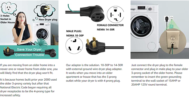 • Connects yours new dryer to old home outlet. By its new style 4 prong outlet (14-30R) to 3 prong dryer plug (10-30P). The NEMA 10-30 is an older style outlet that is commonly used for clothes dryers before.