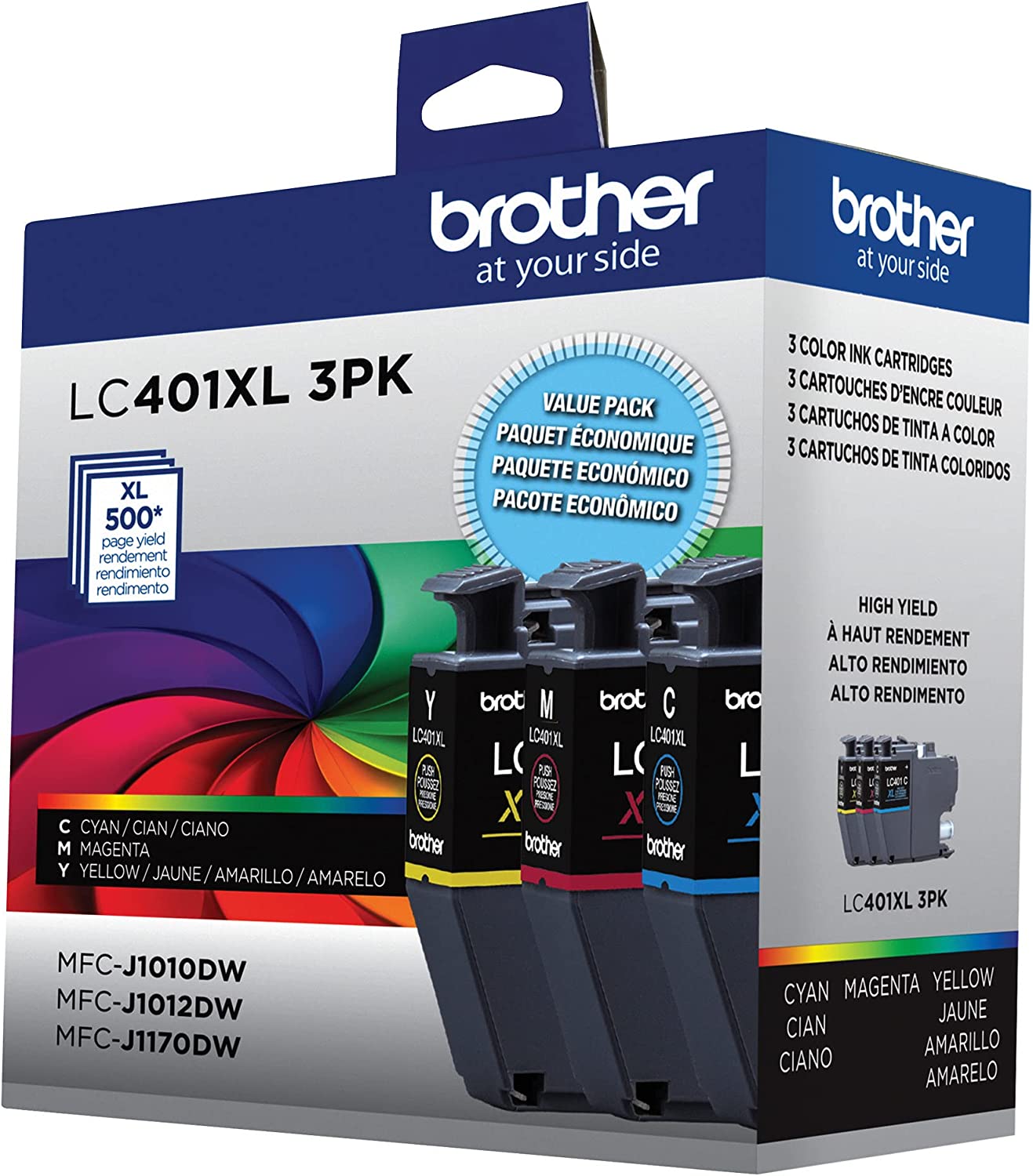 Trust Brother Genuine ink for superior inkjet print quality and performance you can consistently rely on. Brother Genuine LC401XL 3PK High Yield Color Ink Cartridges deliver consistent, professional print quality and ultra convenience you can count on for up to 500 pages per cartridge.(1) Brother Genuine ink is intelligently engineered to work seamlessly with your Brother inkjet printer to consistently produce sharp prints that withstand the test of time. This 3-pack contains one cartridge each of Cyan, Magenta and Yellow ink. Brother Genuine LC401XL 3PK provides the ultimate in convenience giving you the option to get all three ink colors for your Brother inkjet printer at once. A full range of single and multi-pack color and black ink cartridges is available that delivers high quality prints, reliable page yields and exceptional value. Brother Genuine LC401XL 3PK ink cartridges are for use with Brother affordable color inkjet all-in-one printers MFC-J1010DW, MFC-J1012DW and MFC-J1170DW. Brother offers an environmentally responsible way for customers to dispose of Brother Genuine cartridges at end of life. Visit manufacturer’s website for information. Disclaimer: (1) Approximate page yields in accordance with ISO/IEC 24711. For additional page yield info, see manufacturer’s website.