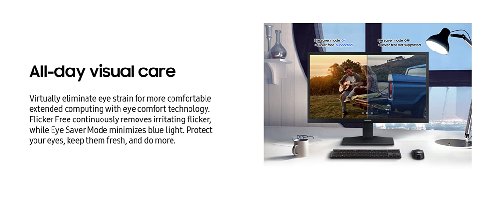 • ALL DAY EYE CARE: Virtually eliminate eye strain for more comfortable extended computing with eye comfort technology; Flicker Free continuously removes irritating flicker, while Eye Saver Mode minimizes blue light; Protect your eyes, keep them fresh, and do more.