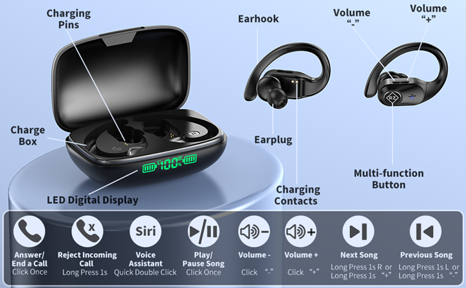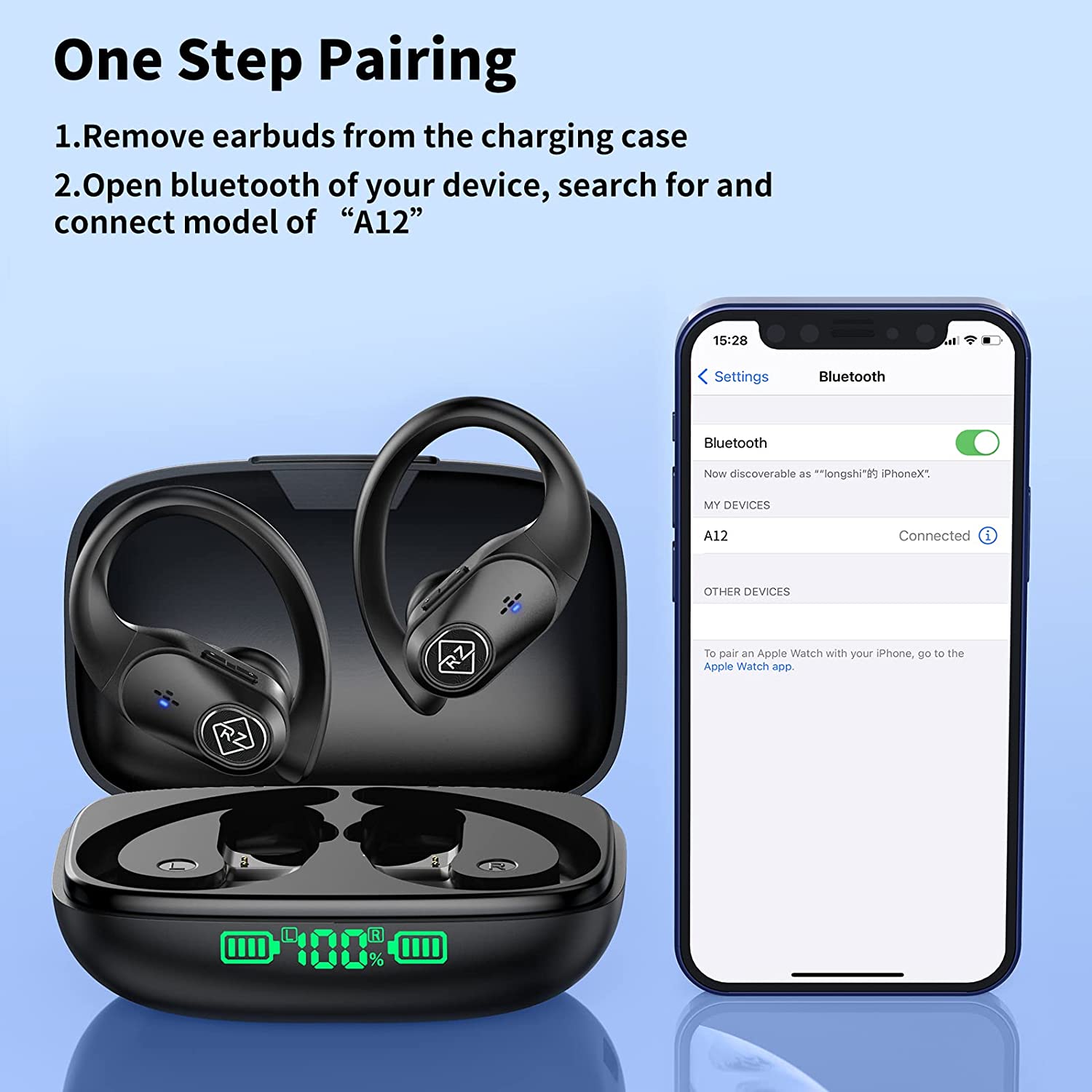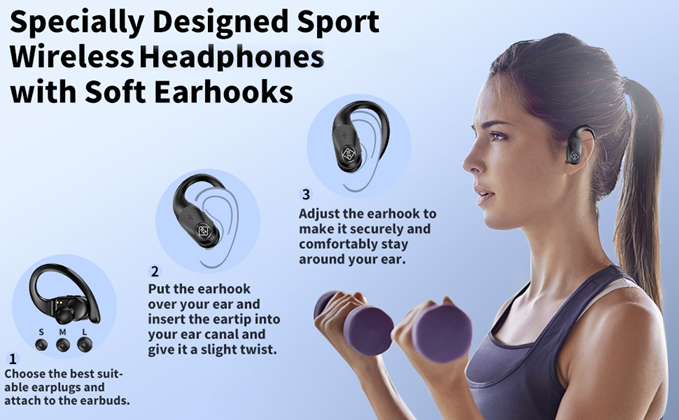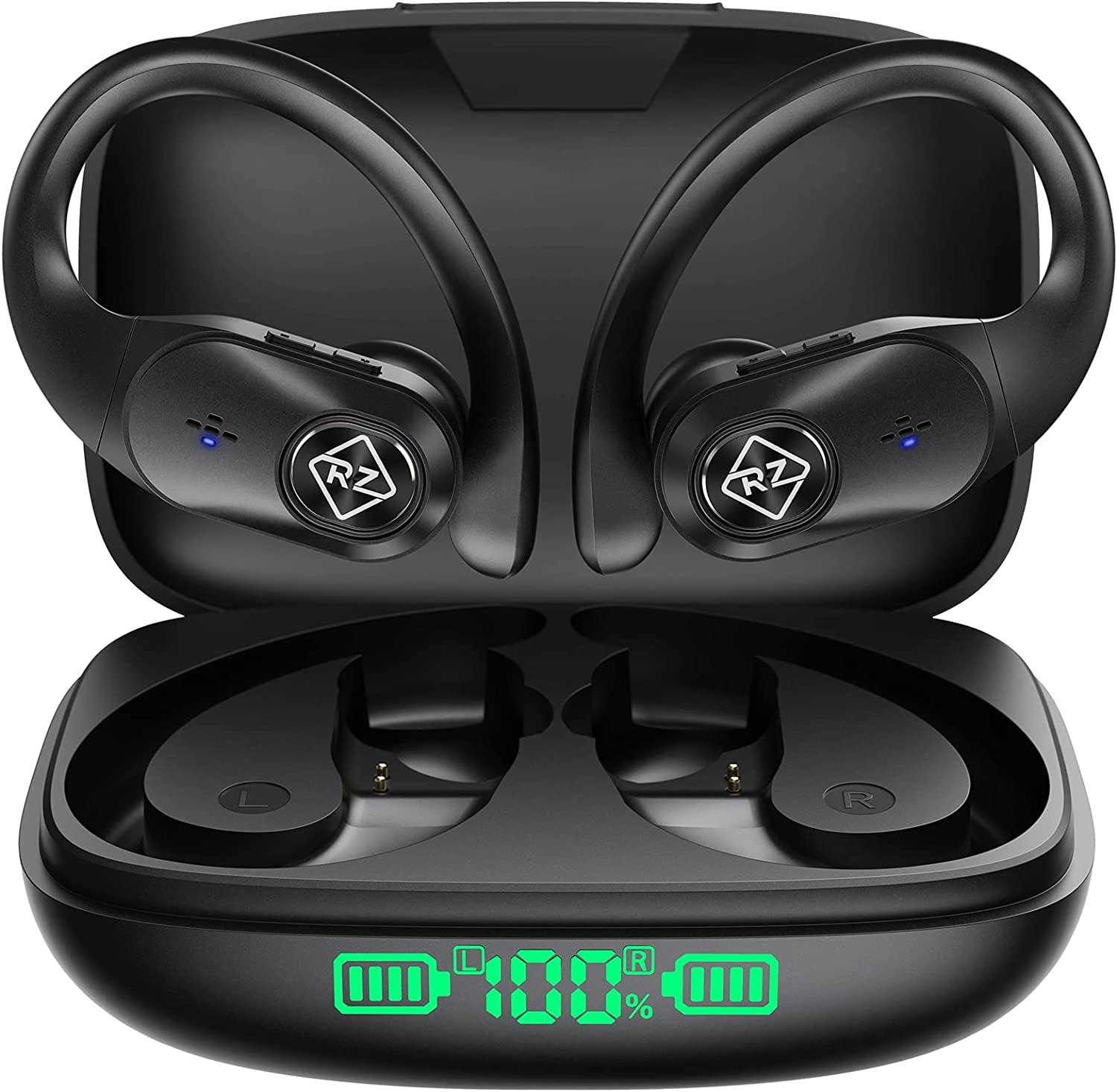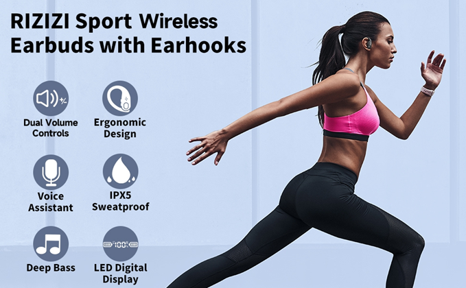 RIZIZI Wireless Earbuds with Earhooks, Made for Exercise, Combine LED Digital Display to Bring You a Day of Quality Music Enjoyment.