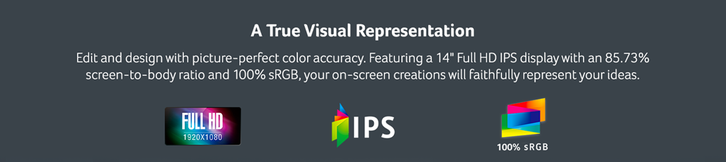 - A True Visual Representation: Create your best content on the 14" Full HD (1920 x 1080) IPS Widescreen LED-backlit 100% sRGB display with 300 nits brightness and 16:9 aspect ratio