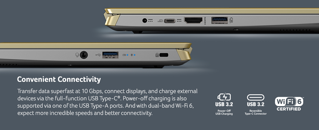 - Ports For All Your Accessories: USB Type-C Port USB 3.2 Gen 2 (up to 10 Gbps) DisplayPort over USB Type-C & USB Charging, 2 USB 3.2 Gen 1 (1 Power-off Charging), HDMI 2.0 with HDCP support, Headphone/Microphone-in Jack, DC-in for AC adapter