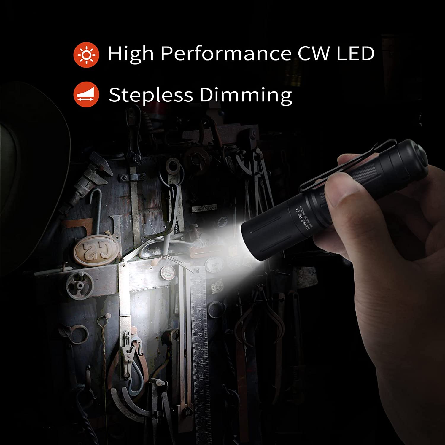 LED: XP-L2.Working voltage: 2.75v to 4.2v.Powered by: Rechargeable battery (Built-in).Modes & Run-time:- Turbo: 1022 lumen ~ 191 lumen (1.5 mins+145 mins);- Infinity High: 478 lumen ~ 208 lumen (1 min+150 mins);- Infinity Low: 13 lumen (37 hours);- Firefly: 0.41 lumen (15 days);- Strobe: 92 lumen (260 mins).Max output: 1022 lumens.Max run time: 15 days (firefly mode).Battery: Rechargeable battery (Built-in).Max beam distance: 134 meters.Peak beam intensity: 4500cd.Impact-resistant: 1.5 meters.Waterproof to IPX-8 Standard (2 meters).Weight: 65.5 grams with battery.Dimensions: 96mm*21mmAccessories: Pocket Clip *1, USB-C Charging Cable *1OperationLock/UnlockUnder the lockout mode, press and hold the tail switch to unlock the flashlight to enter firefly mode.Under firefly mode, press and hold the tail switch to access the lockout mode.Click the tail switch, the light will flash to indicate that it is locked.Turn-ON/OFFAfter the light is unlocked, single-click the tail switch to turn the light on/off.Change ModesWhen the light is unlocked and off, single-click the tail switch to the last used mode ( except firefly, turbo, strobe). Then press and hold the tail switch to circle through infinity high and infinity low.Double click quickly to turbo from any mode. Triple-click quickly to get strobe.Shortcut to firefly: When the light is off, press and hold the tail switch to get firefly mode.Rechargeable FunctionUnscrew the head cover to expose the USB-C charging port. Plug the USB-C connector into the charging port on the light. Plug the other end into a USB power supply (not included). During charging, the indicator is RED. After being fully charged, the indicator will be BLUE. The Light will blink when the battery is at a low power level. Please recharge the battery.