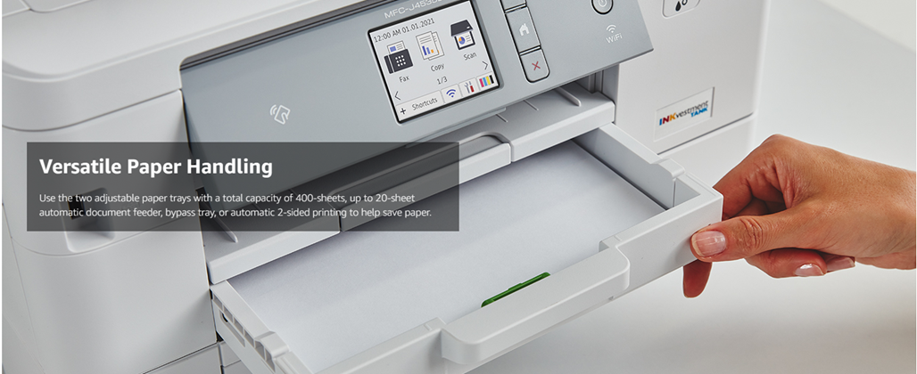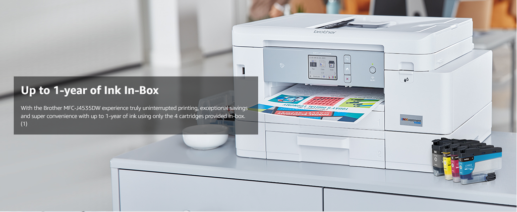Finish large print jobs efficiently in your office using a Brother MFC-J4535DW INKvestment Tank Wireless Inkjet All-in-One Color Printer. A 400-sheet input tray makes it easy for the office to accomplish their tasks 1 after the other. Print from your phone or a tablet while you’re away from your desk thanks to Wi-Fi Direct technology built into this wireless all-in-one printer. NO INK REPLACEMENT FOR UP TO 1-YEAR(1): Experience truly uninterrupted printing, exceptional savings and super convenience with up to 1-year of ink using only the four cartridges provided in-box.(1) PUT THE POWER OF PRINTING AT YOUR FINGERTIPS: The simple to use free Brother Mobile Connect(2) App delivers easy onscreen menu navigation for printing, copying, scanning, and printer management from your mobile device. THE BROTHER REVOLUTIONARY INKVESTMENT TANK SYSTEM: Brother INKvestment Tank printers feature reengineered ink cartridges that hold more ink and deliver a continuous ink supply to the internal tank for truly convenient, uninterrupted printing. ELIMINATE INK REPLACEMENT GUESSWORK: Print with confidence using the Brother Page Gauge,(3) a visual, numerical way to know the amount of ink used and the amount of ink remaining to help take the guesswork out of when to replace ink. USES BROTHER GENUINE INKVESTMENT TANK INK: Intelligently engineered to work with your INKvestment Tank inkjet printer. Standard Yield: LC406BK, LC406C, LC406M, LC406Y, LC406 3PK, LC406 4PK. High Yield: LC406XLBK, LC406XLC, LC406XLM and LC406XLY. BROTHER AT YOUR SIDE SUPPORT: 2-Year Limited Warranty and At Your Side support for the life of your product - visit us at www.brother.com. REFRESH: Large page yields means less ink replacement. When you do need to replace your ink supply, choose Brother Genuine LC406 Standard or High-Yield INKvestment Tank replacement cartridges for even more convenience. To avoid worrying about running out of ink again, get started with Refresh EZ Print Subscription service and save