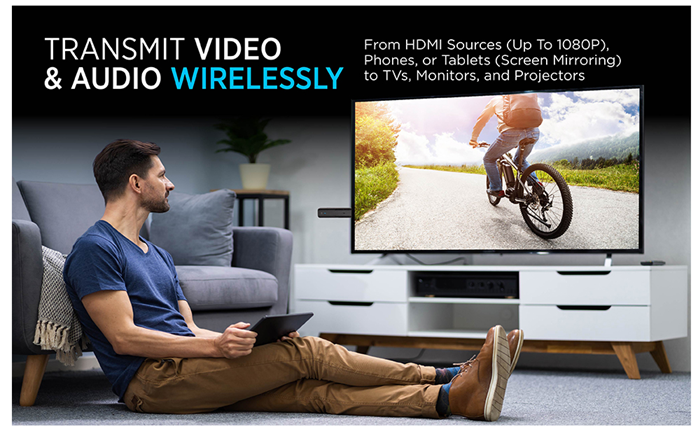 • Transmit Video & Audio Wirelessly From HDMI Sources (Up To 1080P), Phones, or Tablets (Screen Mirroring)