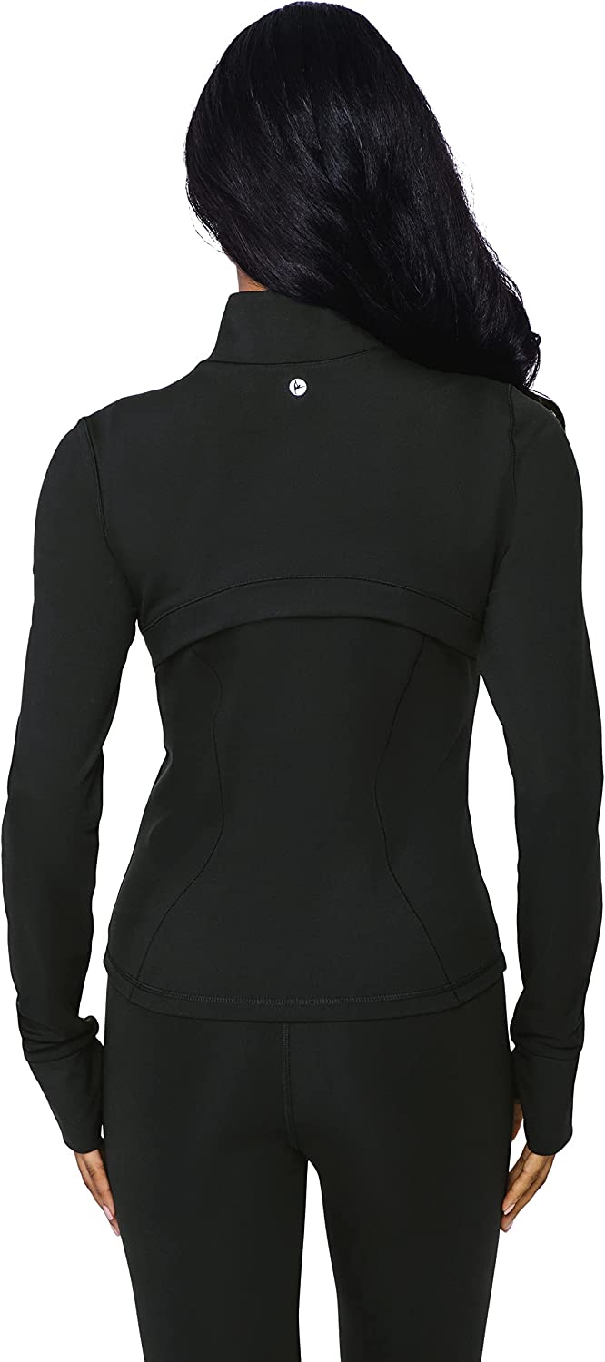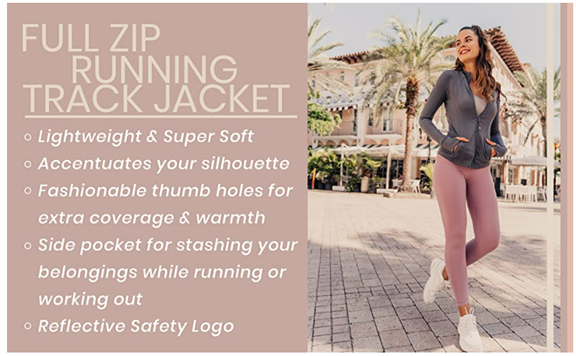 • Front Pockets and Thumbholes. Our sports jacket with zipper was designed for the active woman on the move. Don't want to carrry a bulky purse? Not to worry, this women’s performance jacket has two front pockets to store your wallet, smartphone and keys! This athletic jacket also offers thumb holes to increase hand coverage and warmth during the chilly seaons.