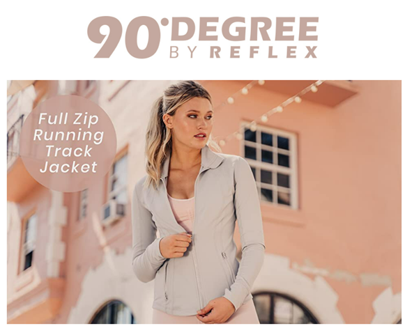 • Amazon's Best Seller. The 90 Degree by Reflex Women’s Lightweight, Full Zip Running Track Jacket provides you with a super soft layer of warmth without overheating or preventing ventilation. This slim fit full zip up innovative style was made for all body shapes, offering comfort and accentuating your silhouette. Perfect activewear for yoga, exercise, gym, fitness, running, any type of workout, or everyday use.