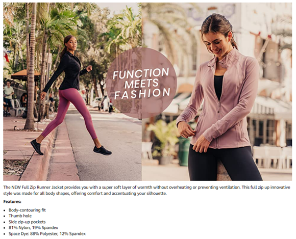 • Maximum Comfort. ​This slim fit women’s track jacket is light and airy with soft to the touch fabric, ​comprised of 81% Nylon, 19% Spandex (Solid) and 88% Polyester, 12% Spandex (Space Dye). This specially designed womens running jacket promotes warmth and airflow, while preventing overheating. Compare your hip, waist and inseam measurements with our size guide to help you determine the perfect size for you! Approximate model size (S).
