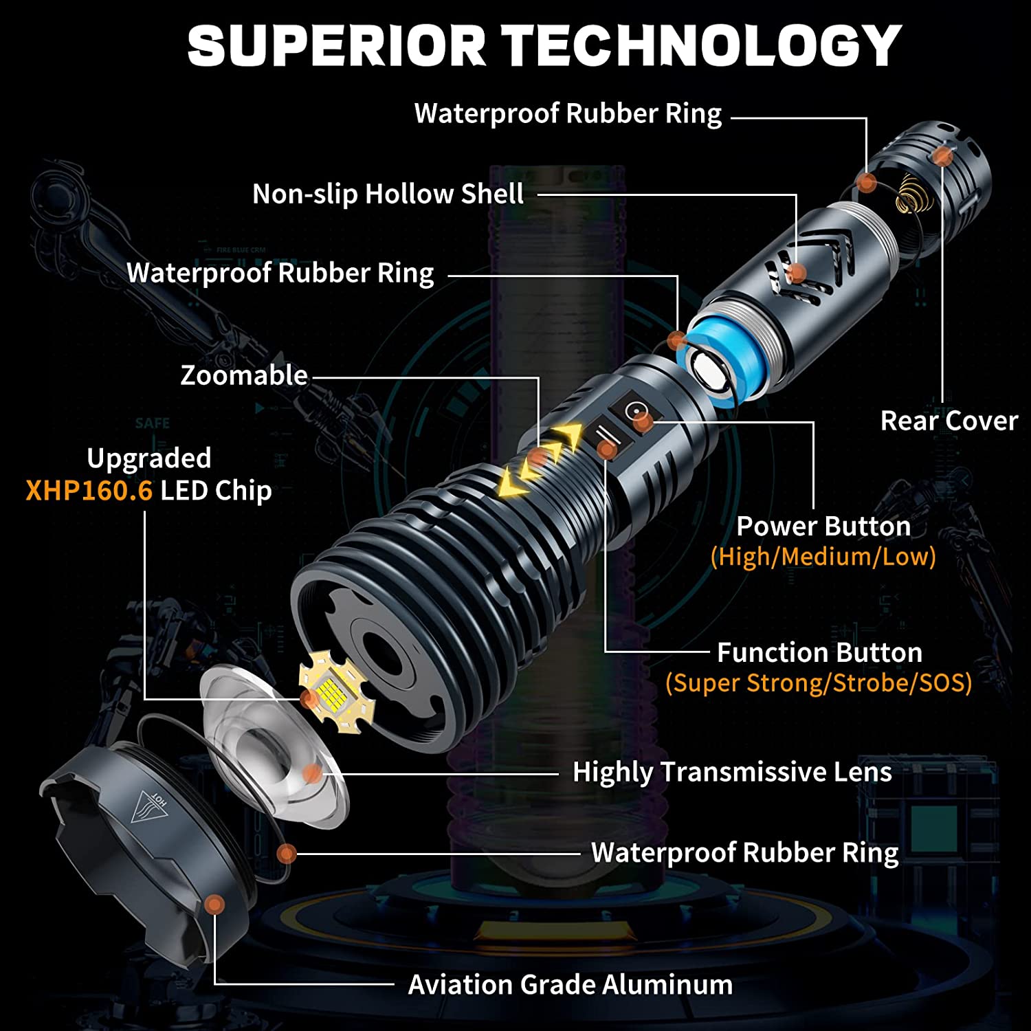 Rechargeable Flashlights 180000 High Lumens,XHP160.6 Super Bright LED Flashlight,Tactical Powerful Waterproof Handheld Flashlights with Zoomable 6 Modes for Emergencies Camping