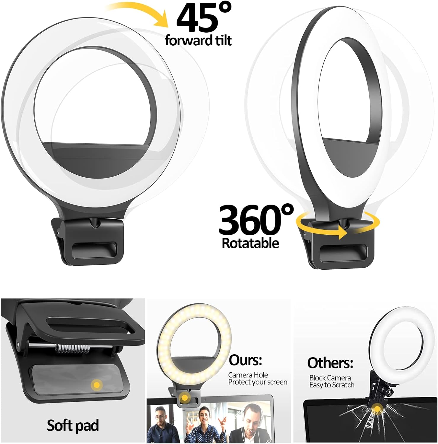 【Secure and Convenient】: The computer ring light features a sturdy clip that attaches easily to the device, and silicone padding that protects your screen from scratches. Take your video conferencing light wherever you go for professional-quality lighting on the go.