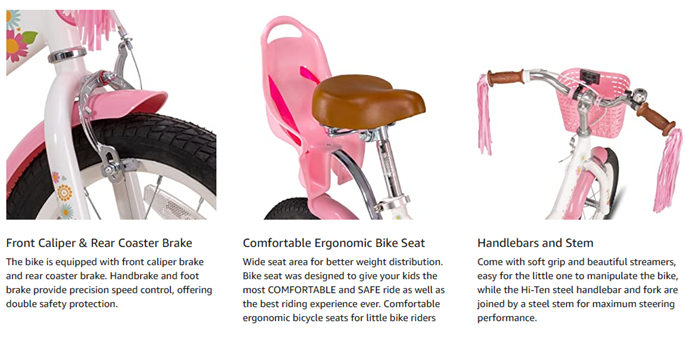 - 1. Amazing Design and Color! JOYSTAR Little Daisy Princess Girls bike with Bright colors, stylish and charming. DIY decals, beautiful basket and doll bike seat add extra fun to the ride. They have adjustable saddle & stem height for a better fit for easy pedalling. Complete with a bell that lets everyone know she's on the move.