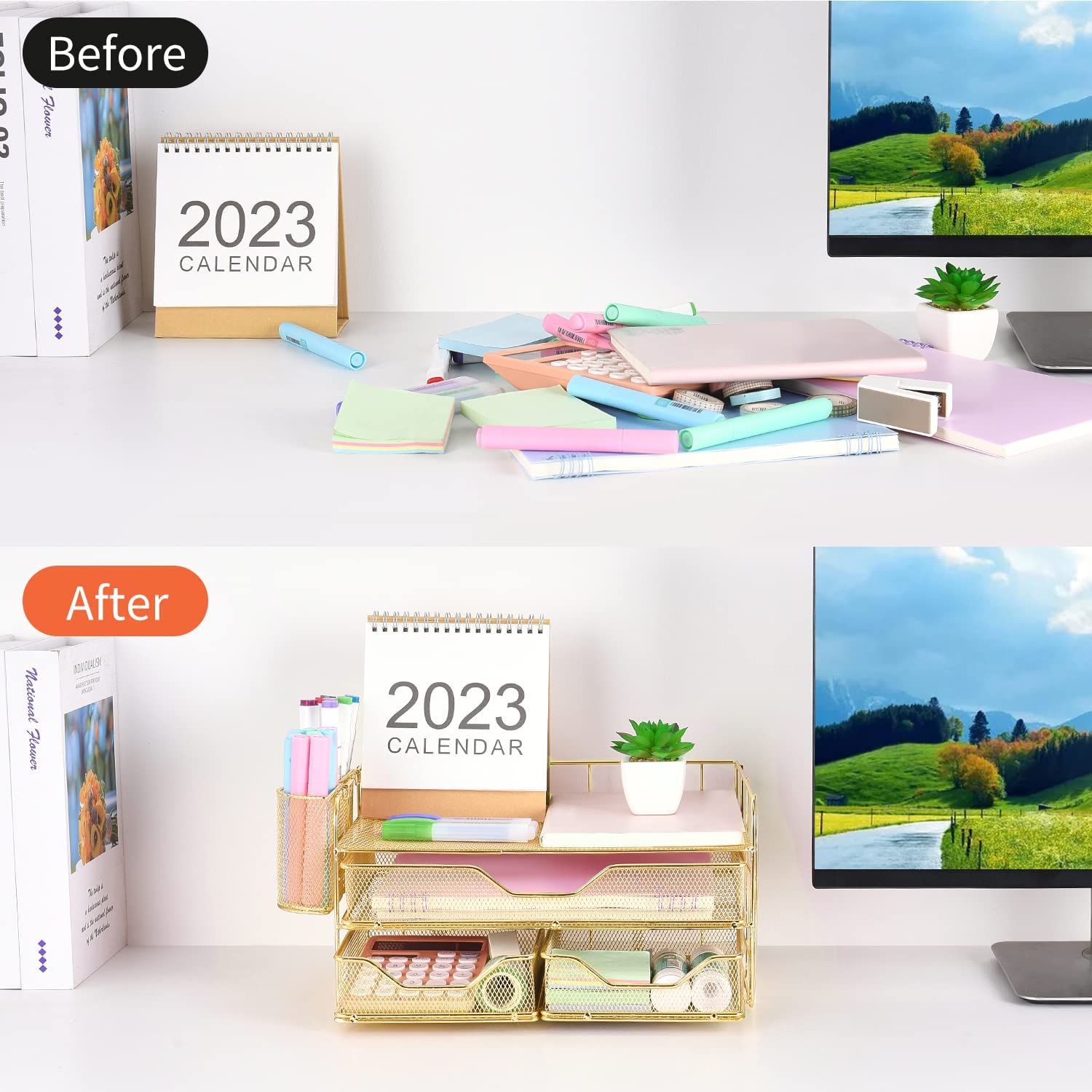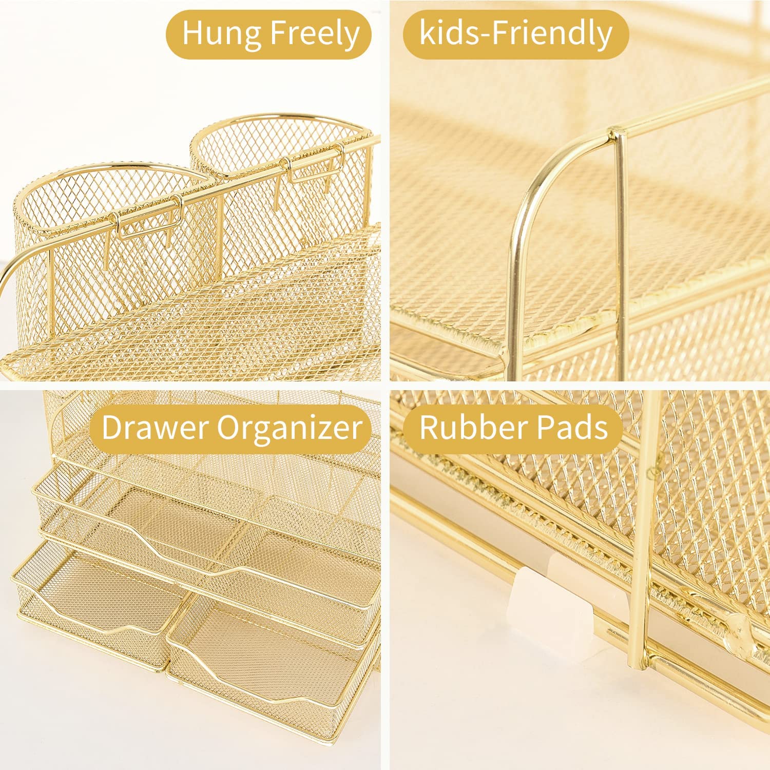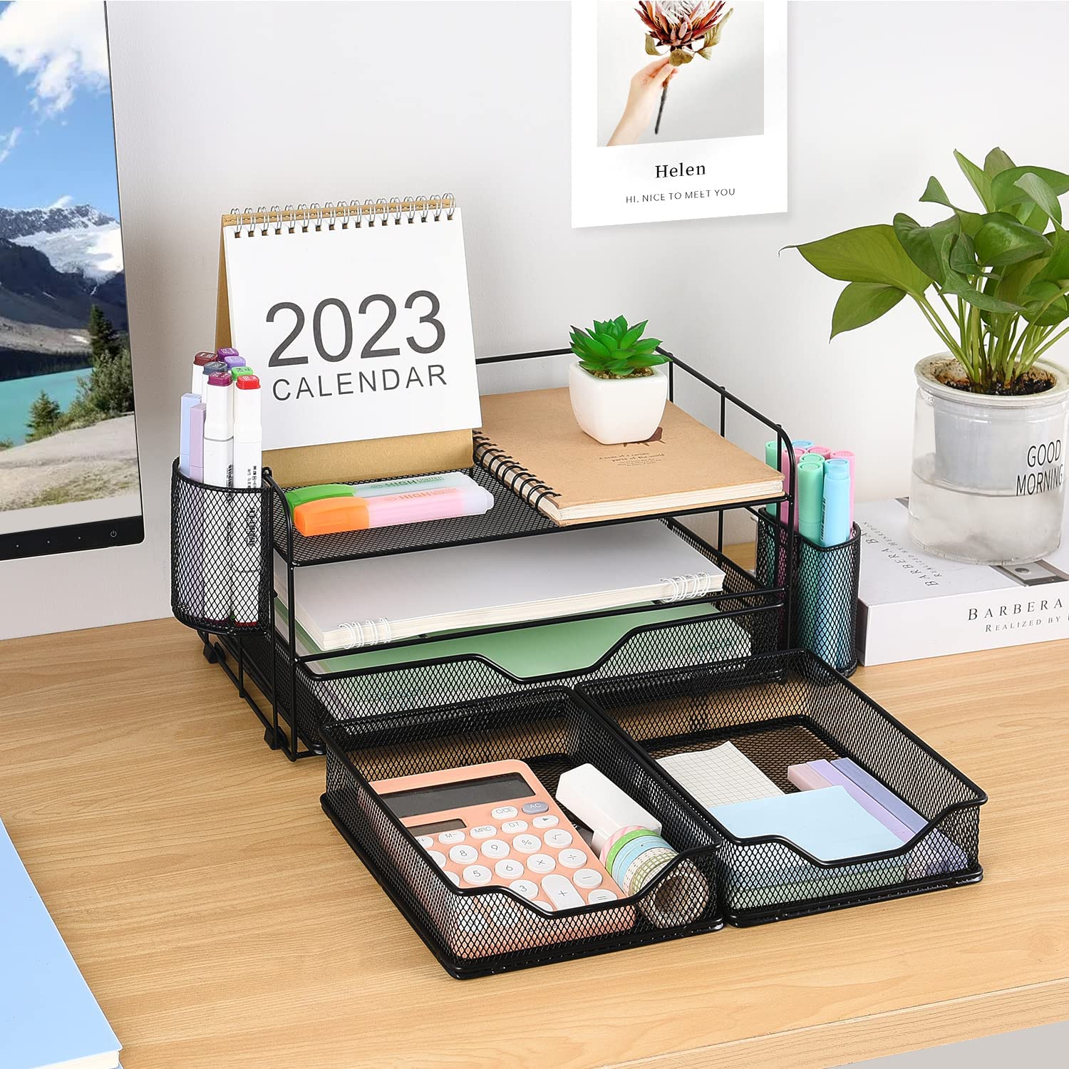 • ? [Perfect Paper Organizer] Desk drawer organizer has open top storage space+2 hanging pen holders+3 different drawers. It is convenient for you to ​quickly identify and sort out desk accessories, letters, and greatly improve your work efficiency.