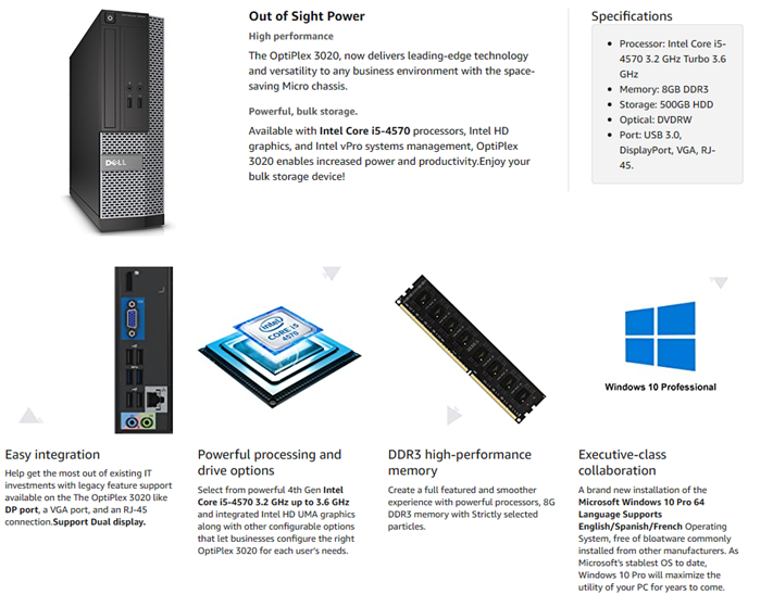 DELL Optiplex 3020 SFF Desktop PC - Intel Core i5-4570 3.2GHz 8GB 500GB DVDRW Windows 10 Professional (Renewed)']