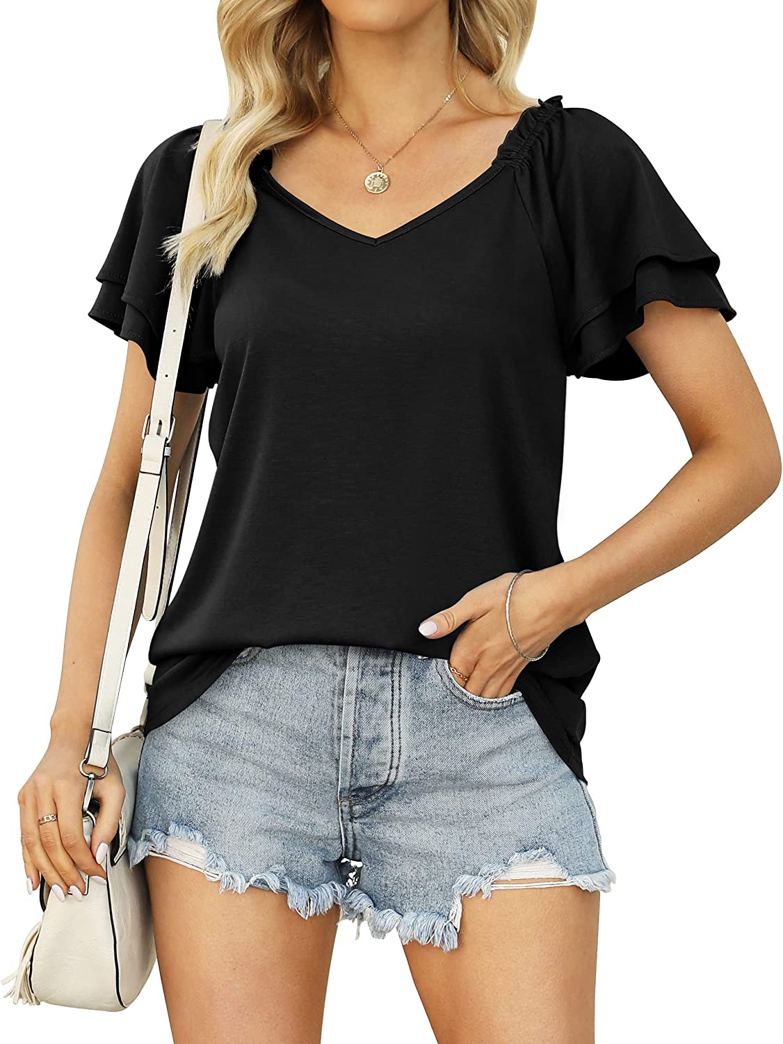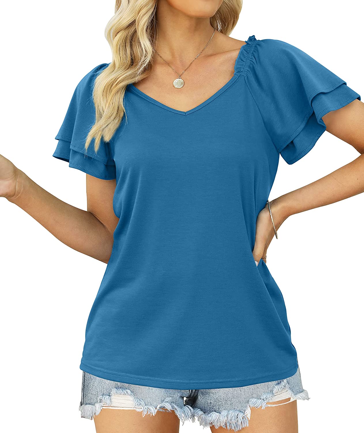 SAMPEEL Womens Summer Tops Ruffle Short Sleeve V Neck T-Shirts Cute Blouse Shirts