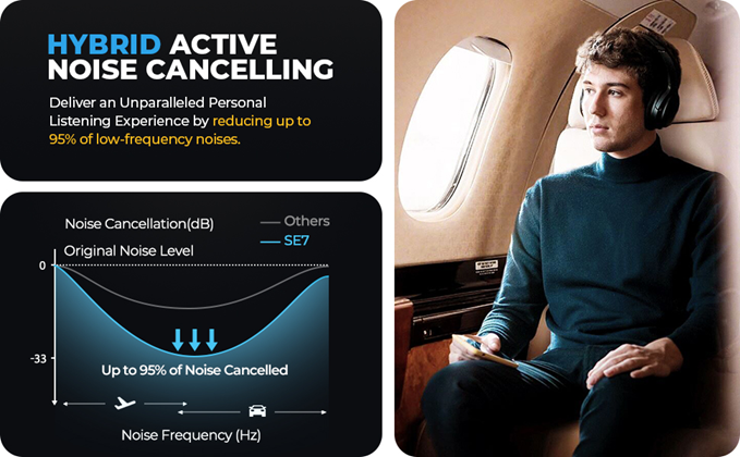 - Immerse Yourself in Music with No Distractions - Our SE7 Bluetooth headphones feature enhanced active noise technology, reducing up to 95% of low-frequency noises around you. Enjoy your music without any interruptions, even in noisy environments, and get fully immersed in your favorite tunes when owning SE7 active noise cancelling headphones.