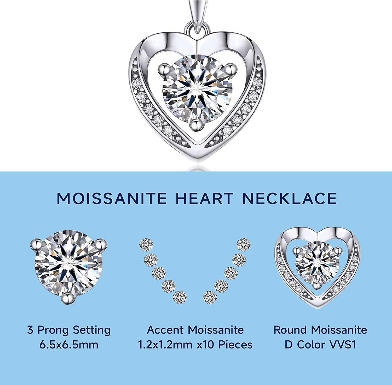 ❤️【Dainty Heart Pendant Necklace】 ➣ This heart necklaces for women is a perfect expression of love. Features a round brilliant cut centre moissanite 6.5mm/1ct 3 prong setting. With 10 accent moissanite. this pendant is suspended from a well-crafted S925 sterling silver chain necklace that can be worn at 16 or 18 inches.
