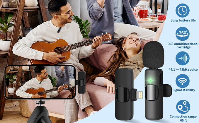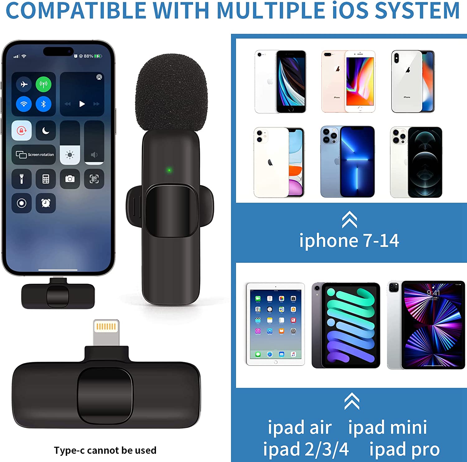 Wireless Microphone for iPhone iPad iPod, Professional Wireless Clip-on Mic, Portable Wireless Lavalier Microphone, Plug-Play Microphone for Video Recording, TikTok, Facebook, YouTube,Live Stream