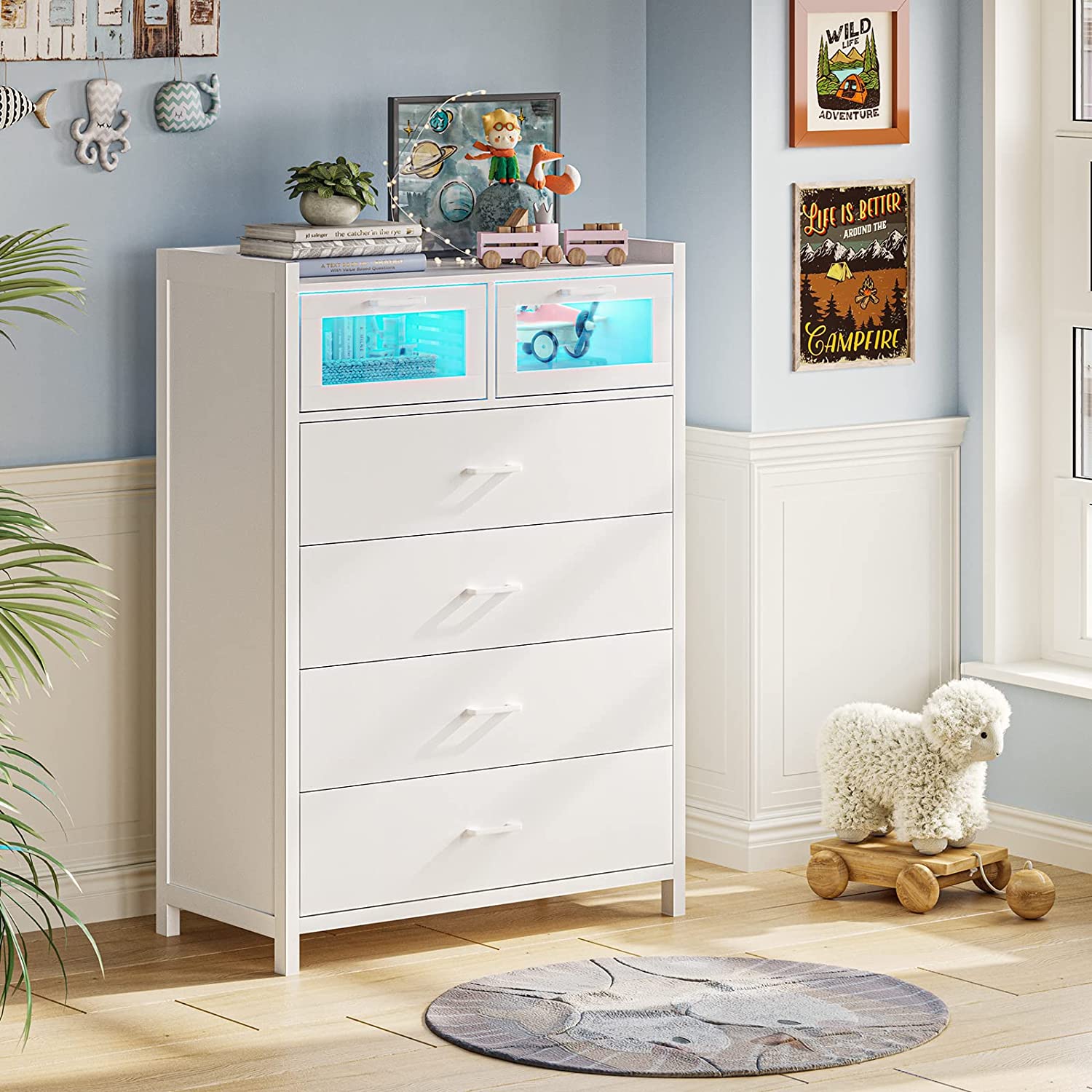 VIAGDO Dresser for Bedroom, Chest of Drawers with LED Lights, White Tall Dresser with 6 Drawers, Wood Large Capacity Storage Cabinet for Nursery, Kids Room, Entryway