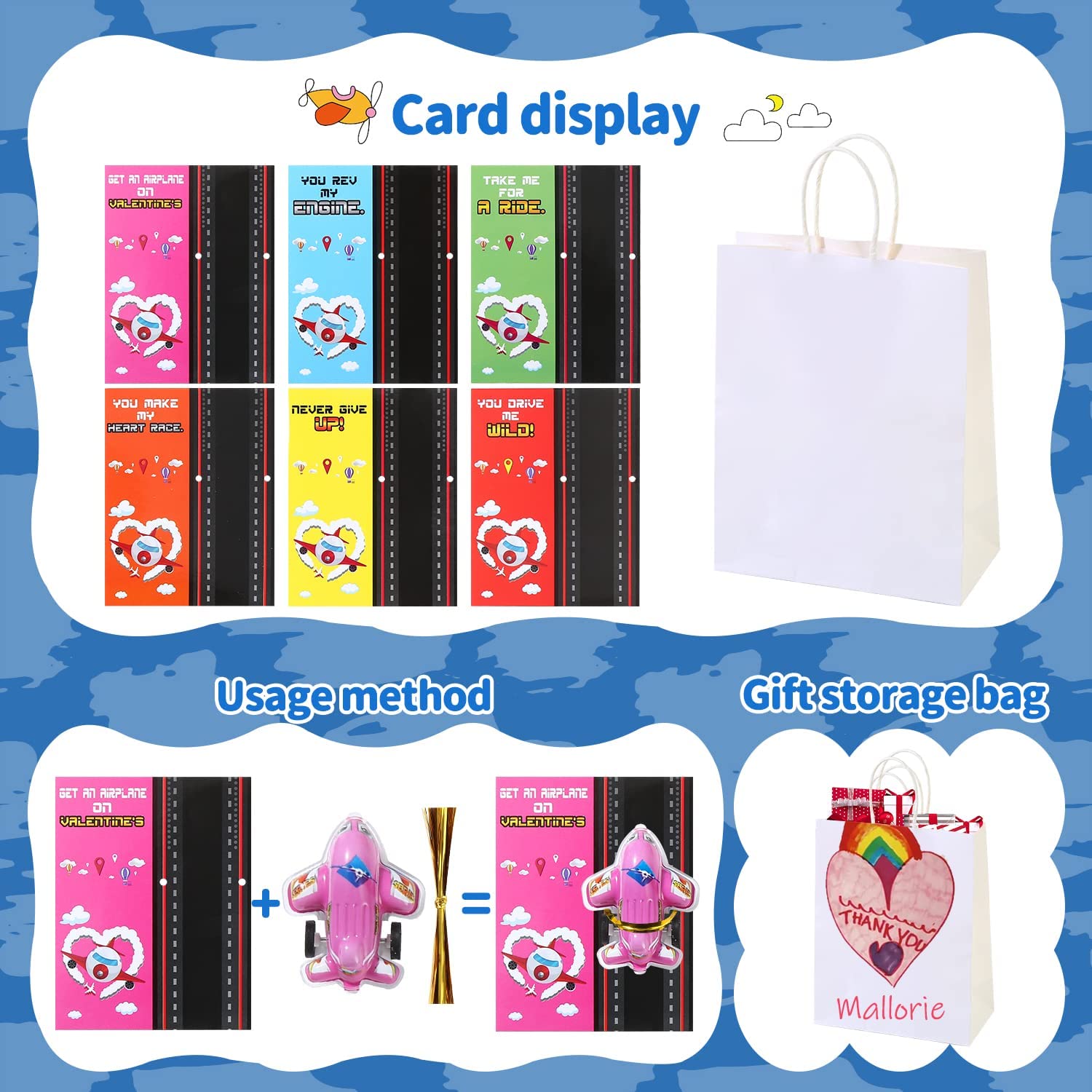• INCLUDES & SIZE: 28pcs mini cute pull back airplane toys(random packaged, size 1.96 x 1.6 inch); 28pcs valentines cards(6colors with name columns on the back, size 3.5x2.8inch); a bag of gold twist-ties linking the plane and card; 1pc white DIY valentines day gifts receiving bag(size 9x7x3.5inch).