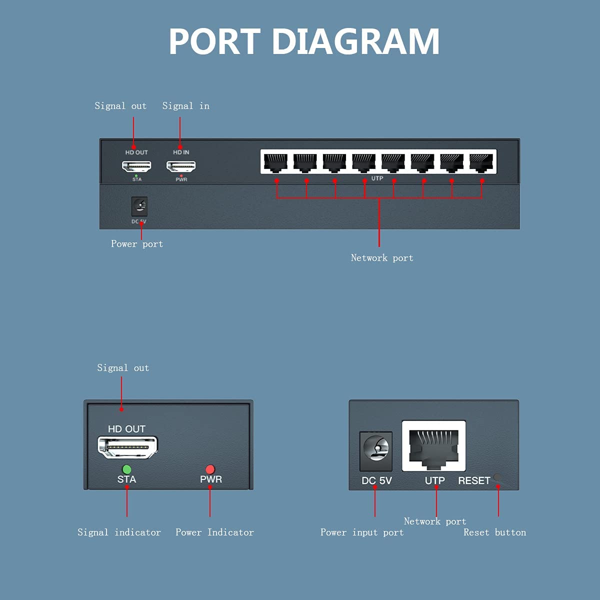 - One HDMI Loop-out: the transmitter is connected to an HDMI monitor to easily check the output status of the signal source.