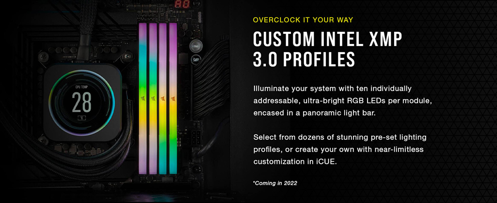CORSAIR VENGEANCE RGB DDR5 memory delivers DDR5 performance, higher frequencies, and greater capacities optimized for Intel® motherboards while lighting up your PC with dynamic, individually addressable ten-zone RGB lighting. Tightly screened high-frequency memory chips enable faster processing, rendering, and buffering than ever, with onboard voltage regulation for easy, finely controlled overclocking. Take control with CORSAIR iCUE software and enable RGB lighting customization, real-time frequency monitoring, onboard voltage regulation, and Intel XMP 3.0 profile customization. A custom PCB provides superb signal quality for high performance and stability on the latest Intel DDR5 motherboards. For cutting-edge DDR5 performance with mesmerizing RGB lighting, VENGEANCE RGB DDR5 lights the way.