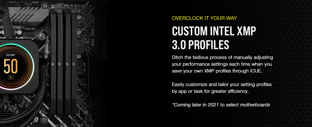 - Custom Intel XMP 3.0 Profiles: Customize and save your own XMP profiles via iCUE to tailor performance by app or task for greater efficiency.