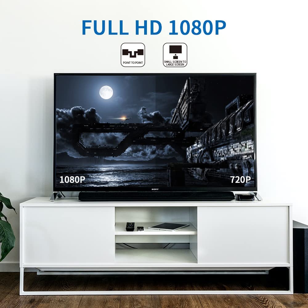 - Supports Full HD 1080p wireless transmission:Mini wireless HDMI extension kit is capable of supporting full HD 1920×1080@60Hz video resolution, thus enabling high quality signal transmission without criticality. Even operating at the maximum resolution, you will not experience slowdown, interruption or lag; transmission will be smooth and steady