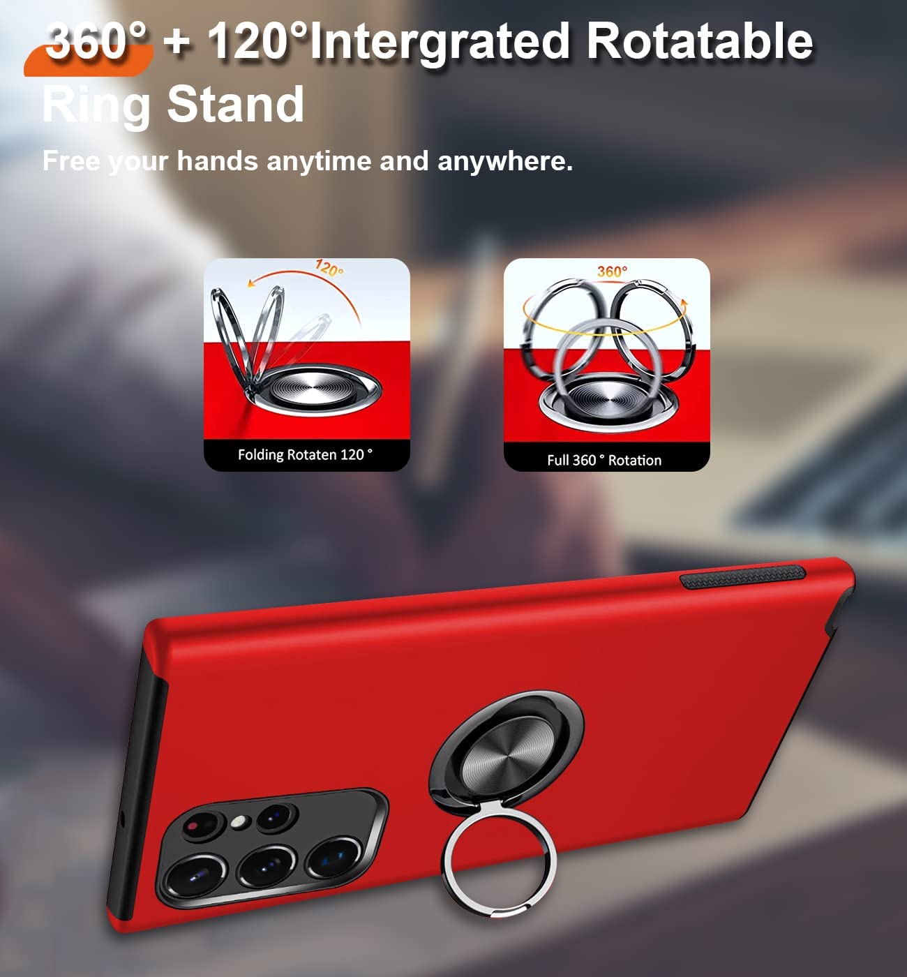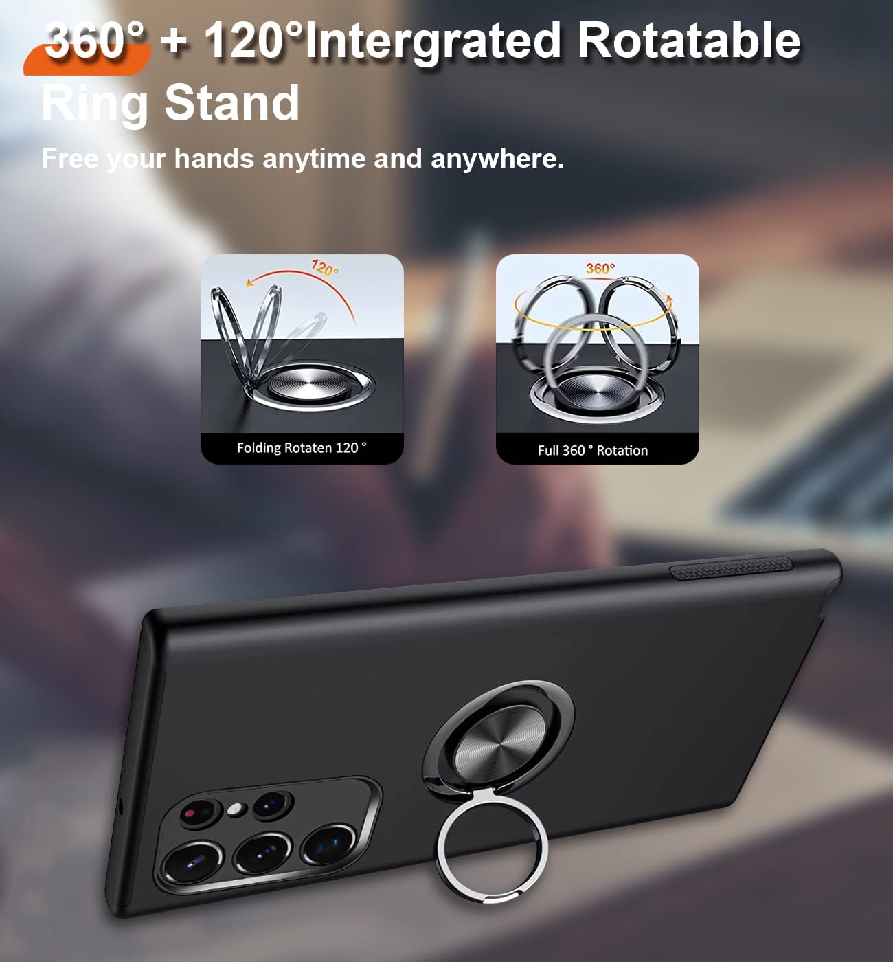 - [2023 Upgraded Kickstand]: Humanized design, 360°horizontal + 120°vertical rotation buit-in stand can lay flat on the back instead of having a large bulge where the ring and magnet are as some cases tend to do. Perfect for hands-free movie viewing. Metal ring kickstand also works greatly with magnetic car mount.