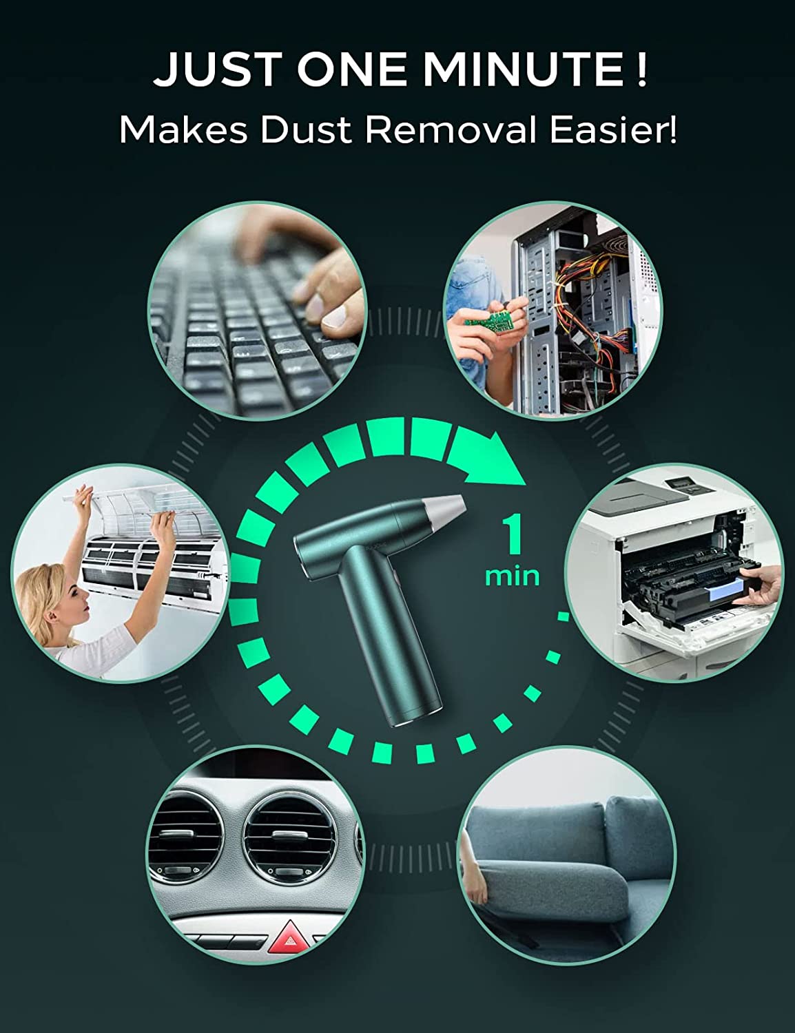- [Perfect compressed air can Alternative] After 1 year of hard R&D, we finally finished the design of this powerful electric air duster which perfectly resolve all the issue you may meet with dust removal. Compare with the canned type, you just need to invest it one-time, but also enjoying more powerful blowing force than other electric type in the market!