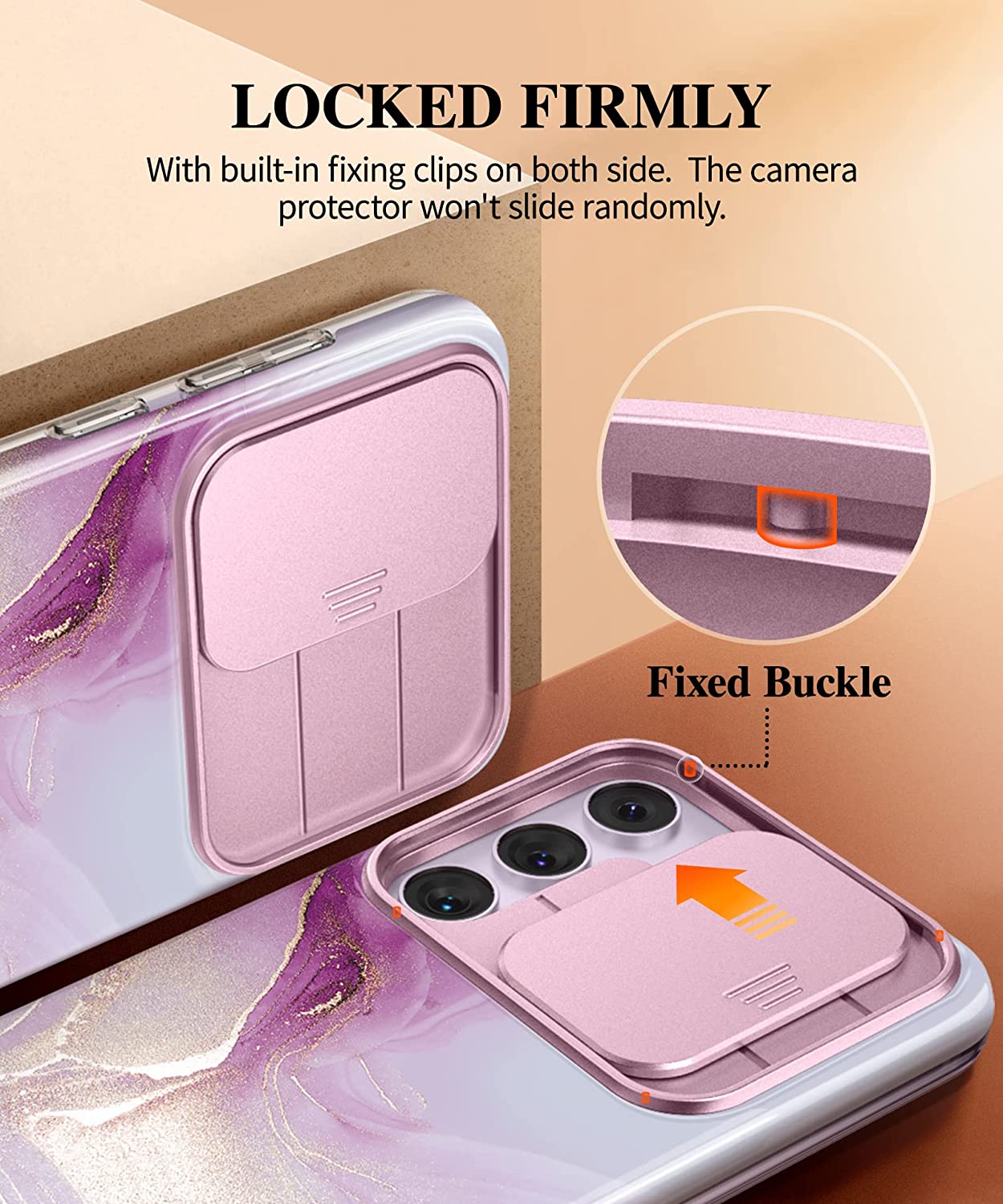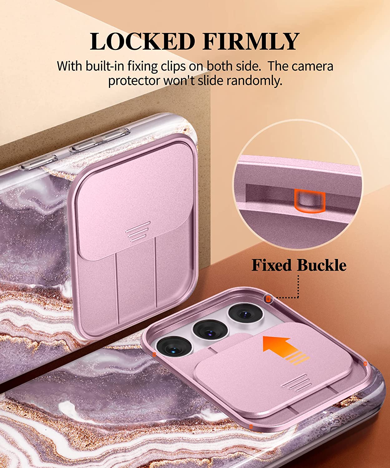 • [Upgraded Slide Camera Cover Protection] The sturdy sliding camera lens cover and raised lip around the camera, can protect your S23 Plus phone camera from scratches, collision, scuffs and impact. The fixing clips at both sides allow a firmer lock that fixes the camera protector in a certain position, won't easily become loose or slide randomly.