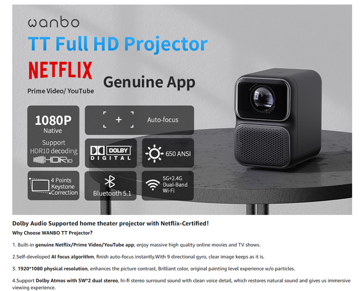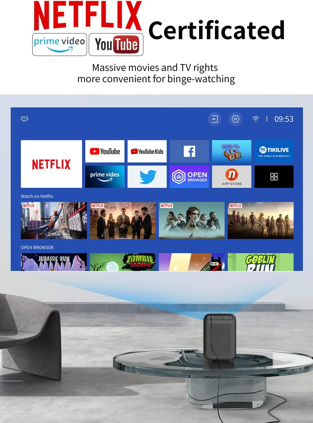 - Netflix-Certified& Dolby Audio Smart Projector : TT Smart projector comes with genuine Netflix, Prime Video, and YouTube apps built-in and supports Dolby Atmos with 5W*2 dual stereo. You can enjoy high-quality online movies and TV shows with hi-fi stereo surround sound that restores natural sound and creates an immersive viewing experience, just like being in a real cinema.