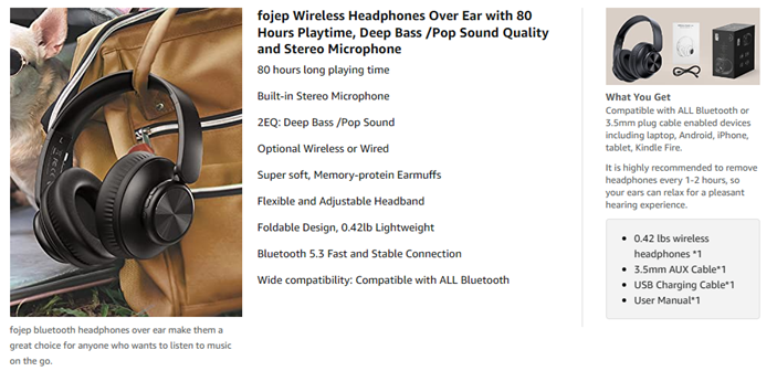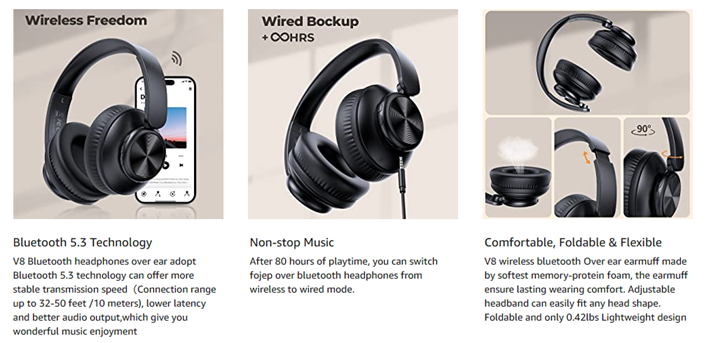 • 【80 Hours of Playtime】 V8 wireless headphones provide 80 Hours of playtime in Wireless mode, triple as much as other Wireless Bluetooth headphones.The over-ear headphones are compatible with all Bluetooth or 3.5mm plug cable enabled devices! fojep Bluetooth headset make them a great choice for anyone who wants to listen to music on the go.