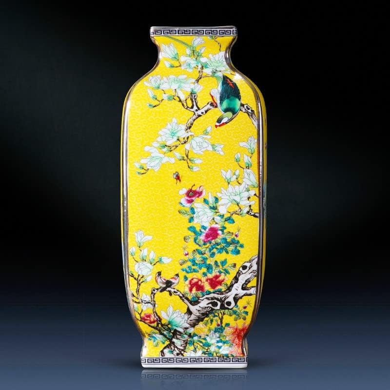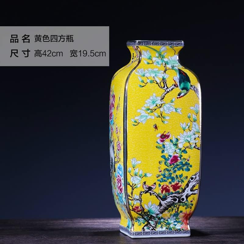 HOUKAI Antique Chinese Style Large Yellow Ceramic Flower Vase Four Sides Pattern Classical Porcelain Vase