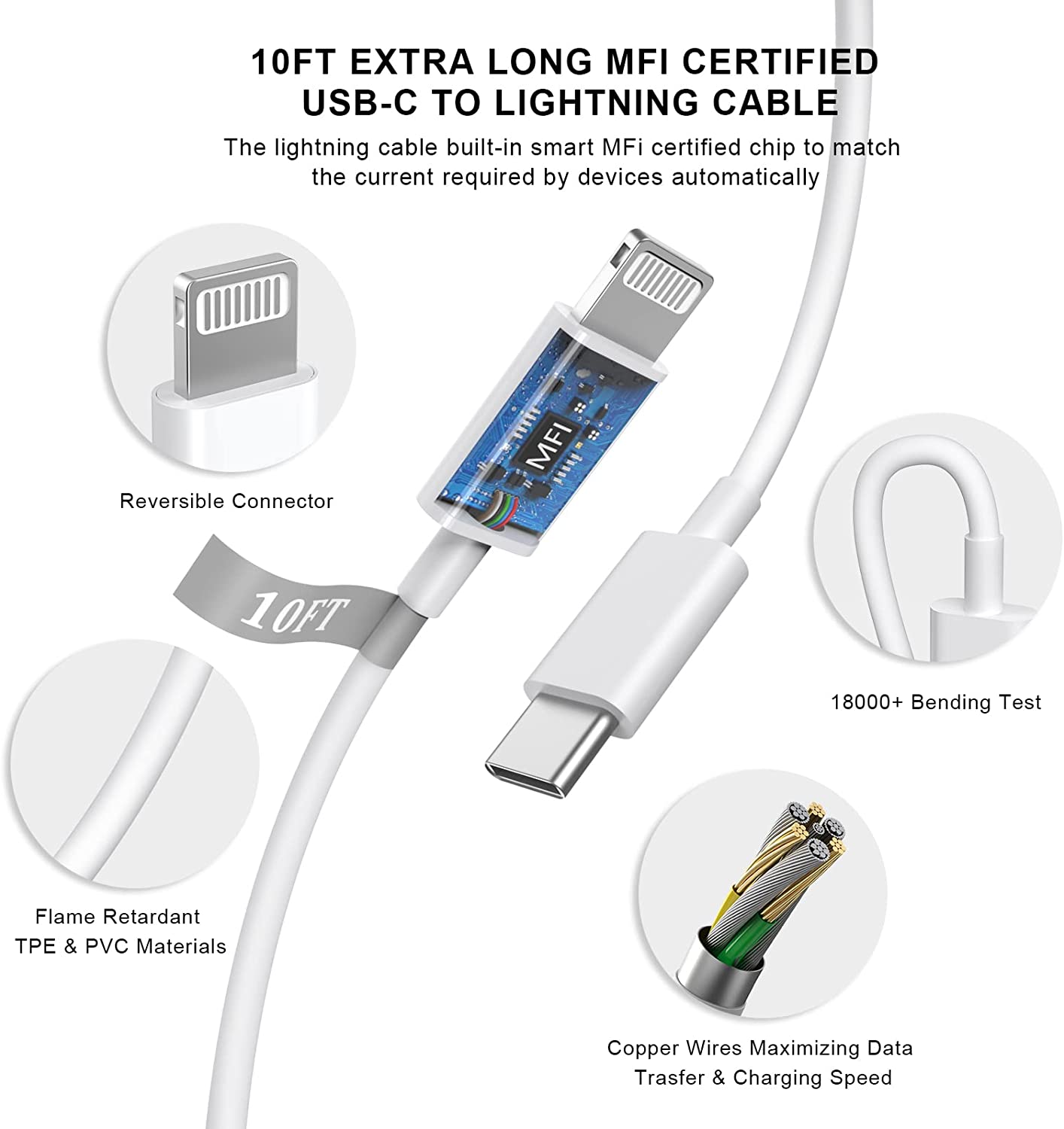 3 Pack [Apple MFi Certified] iPhone Charger Fast Charging Block and 10FT Long USB C to Lightning Fast Charger Cable.