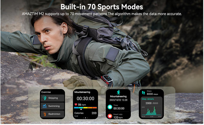 • ⌚24H Health monitoring /70 Exercise modes - AMAZTIM M2 collects the health data with its advanced real-time monitoring function. The fitness watch helps you monitor All-day sleep, 24-hour heart rate, and real-time blood pressure and blood oxygen. The fitness tracking watch includes a pedometer to keep track of the calories burned throughout the day. Supports up to 70 sports modes including indoor and outdoor exercises such as hiking, skiing, swimming, etc. The smartwatches collects the data with pinpoint precision and accuracy, ensuring that every workout is counted.