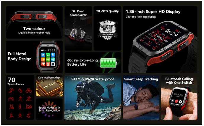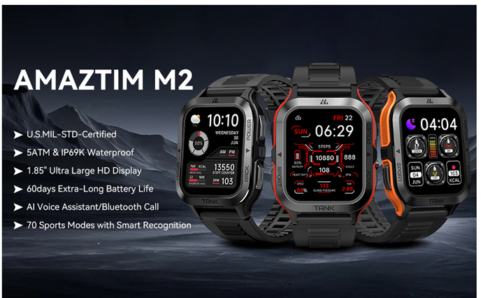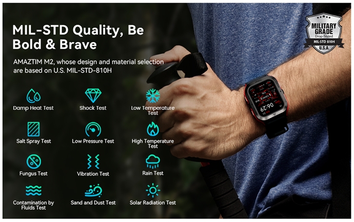 • ⌚Military-Standard quality - AMAZTIM M2 features 1.85-inch second generation Corning Gorilla screen. As the first 9H twin glass cover, it's strong enough to deal with a range of screen-destroying behaviors. The TC4 titanium unibody and the exclusive developed two-color silicone rubber is the world's first two-color integration in a smart watch; military-grade materials and fully enclosed design makes it the toughest and sturdiest watch. Successfully passed 12 Military Tests Including, extreme temperature,dust resistance, salt spray, fluid pollution,etc. Certified to MIL-STD810H , Our smart watches for men ensures that you use them confidently in a variety of harsh conditions.